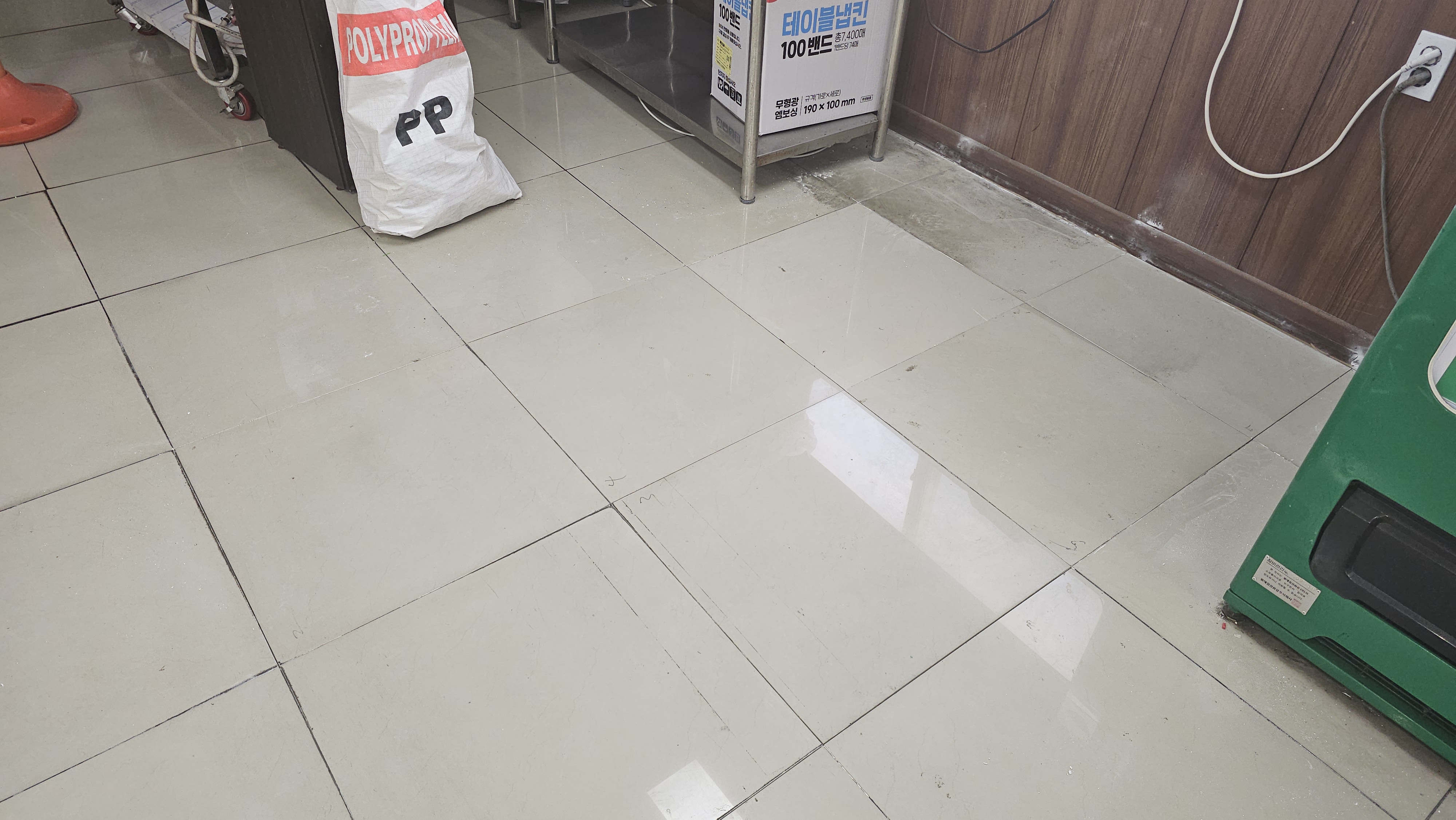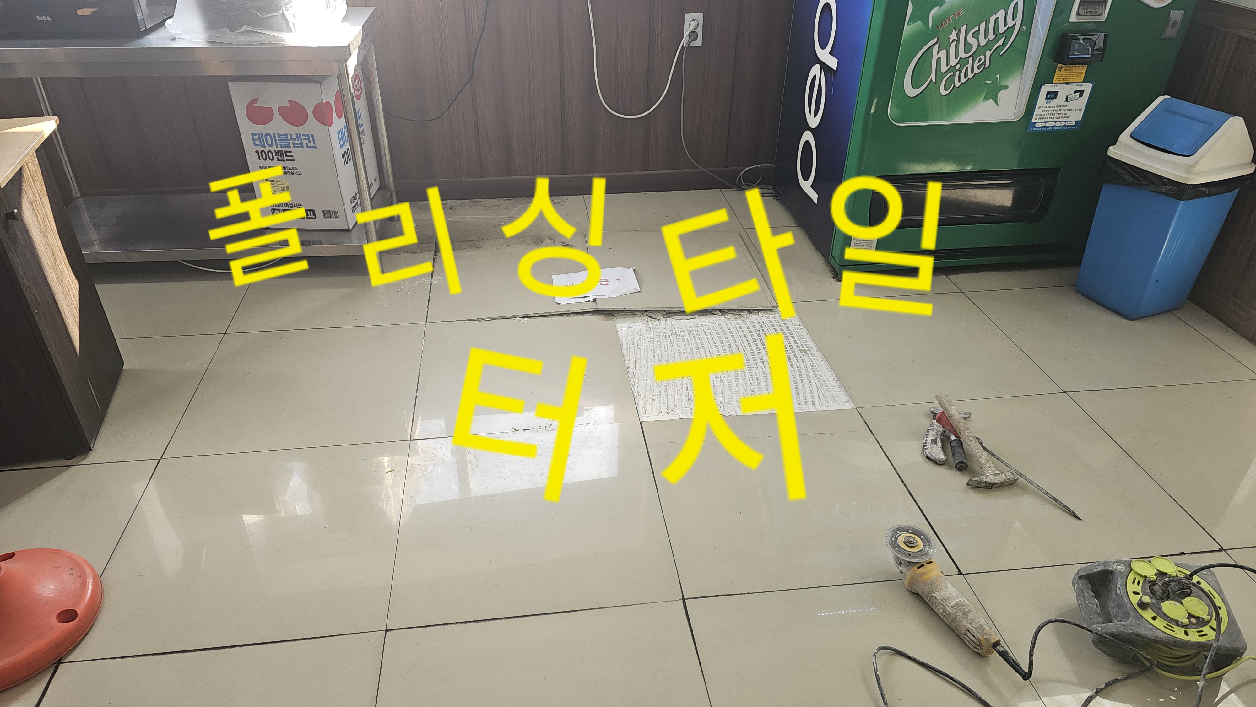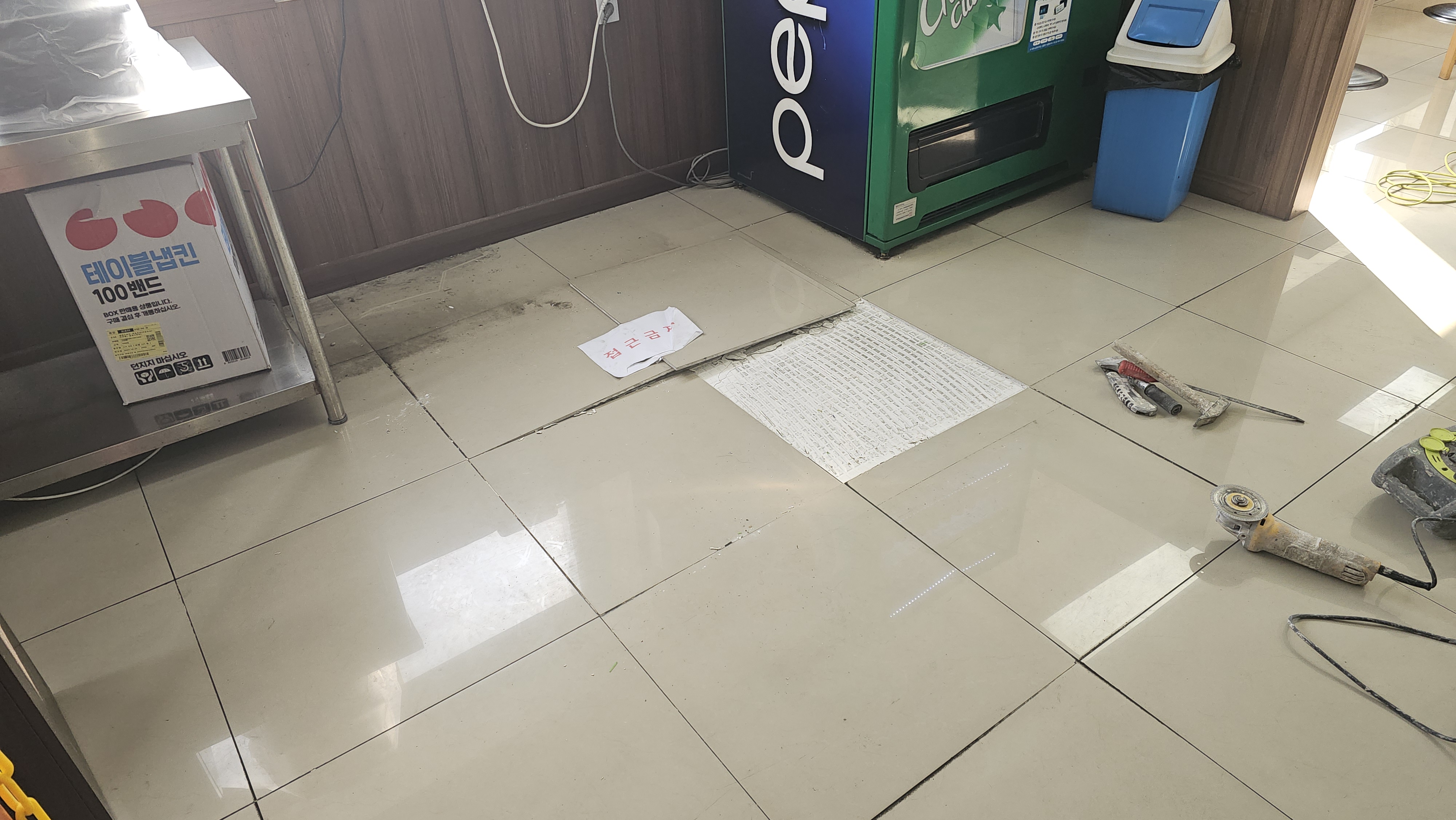 가장 험난한 전장은 바로 육중한 자판기가 버티고 서있는 요충지였소! 자판기의 거대한 압박 아래 갇힌 10여 장의 폴리싱 타일들은 숨조차 쉬지 못한 채 얼굴(표면) 이 퍼렇게 질려 절멸의 위기에 처해 있었나이다. 흥흥 보통의 동네 야메아재 장수들이라면 "이미 숨줄이 끊어졌으니 다 깨부수고 새 타일을 깔자"며 성주(고객)의 곳간을 털려했겠지만, 아 옥토바스는 죽어가는 타일 하나도 소중히 여기는 현장의 화타(華陀) 아니겠소? 흥흥