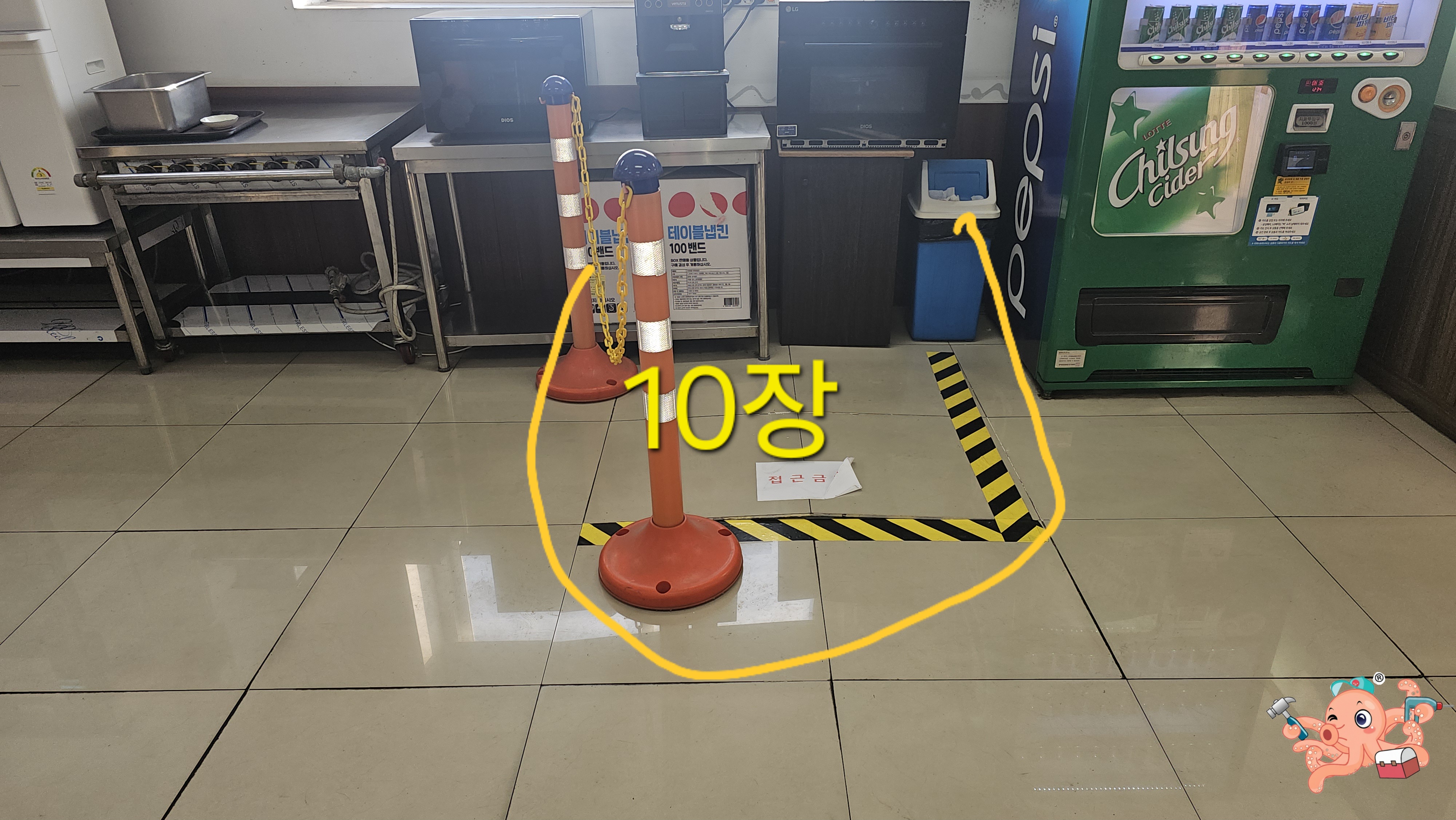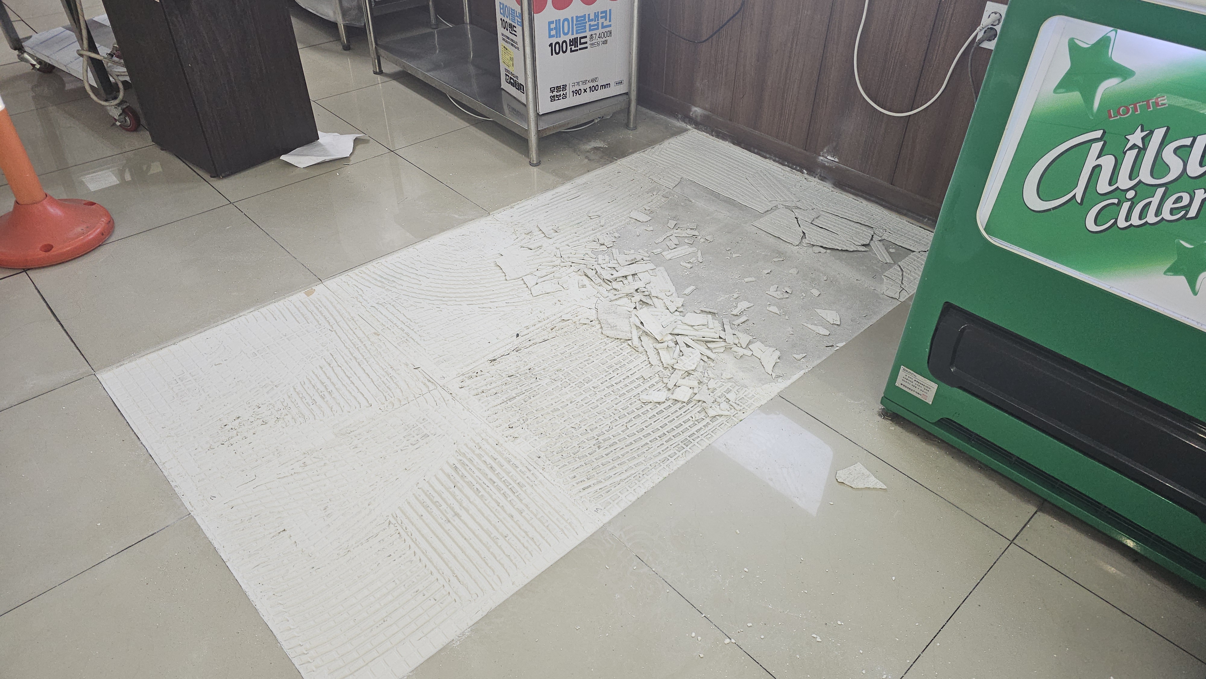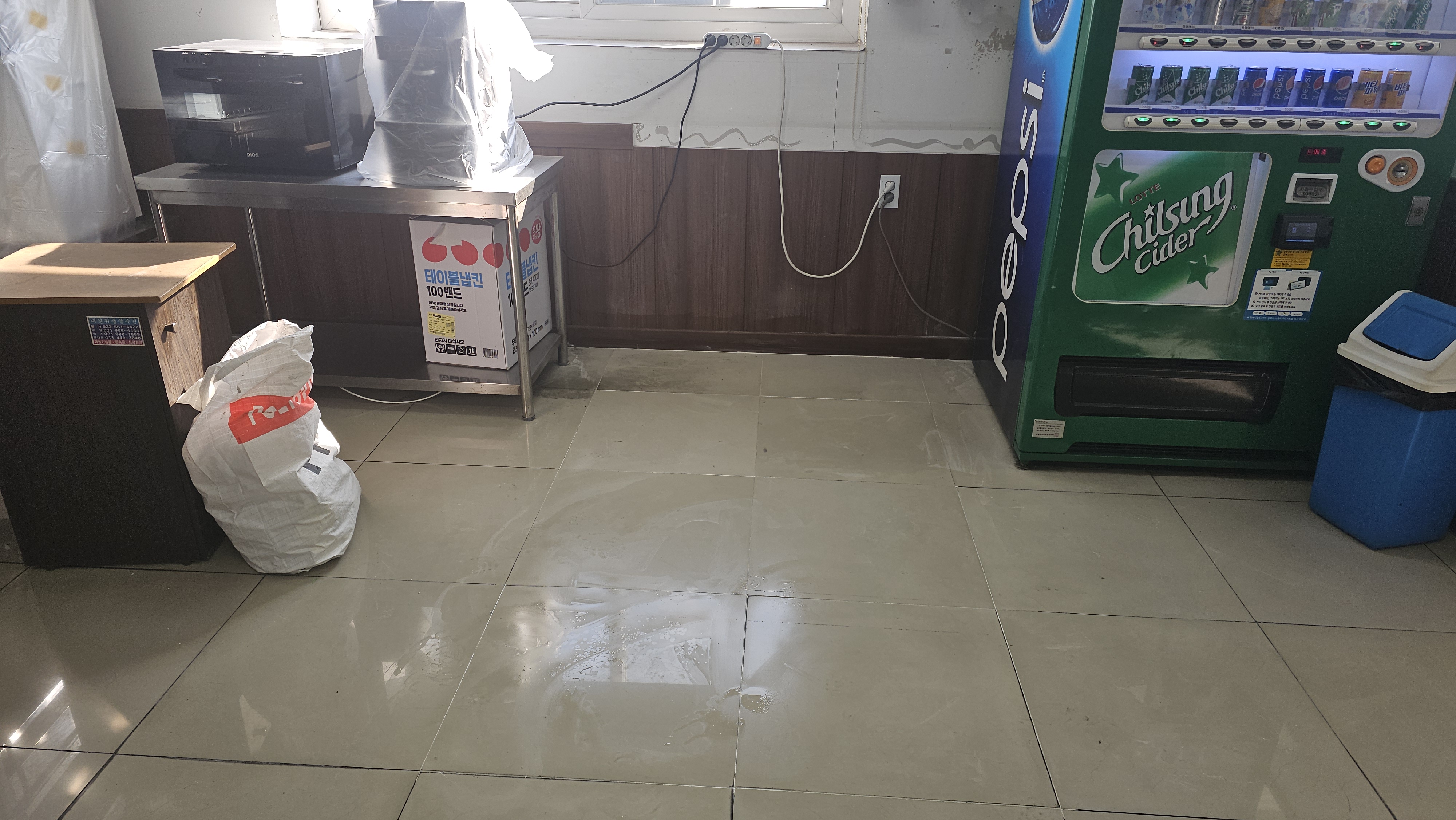 가장 험난한 전장은 바로 육중한 자판기가 버티고 서있는 요충지였소! 자판기의 거대한 압박 아래 갇힌 10여 장의 폴리싱 타일들은 숨조차 쉬지 못한 채 얼굴(표면) 이 퍼렇게 질려 절멸의 위기에 처해 있었나이다. 흥흥 보통의 동네 야메아재 장수들이라면 "이미 숨줄이 끊어졌으니 다 깨부수고 새 타일을 깔자"며 성주(고객)의 곳간을 털려했겠지만, 아 옥토바스는 죽어가는 타일 하나도 소중히 여기는 현장의 화타(華陀) 아니겠소? 흥흥