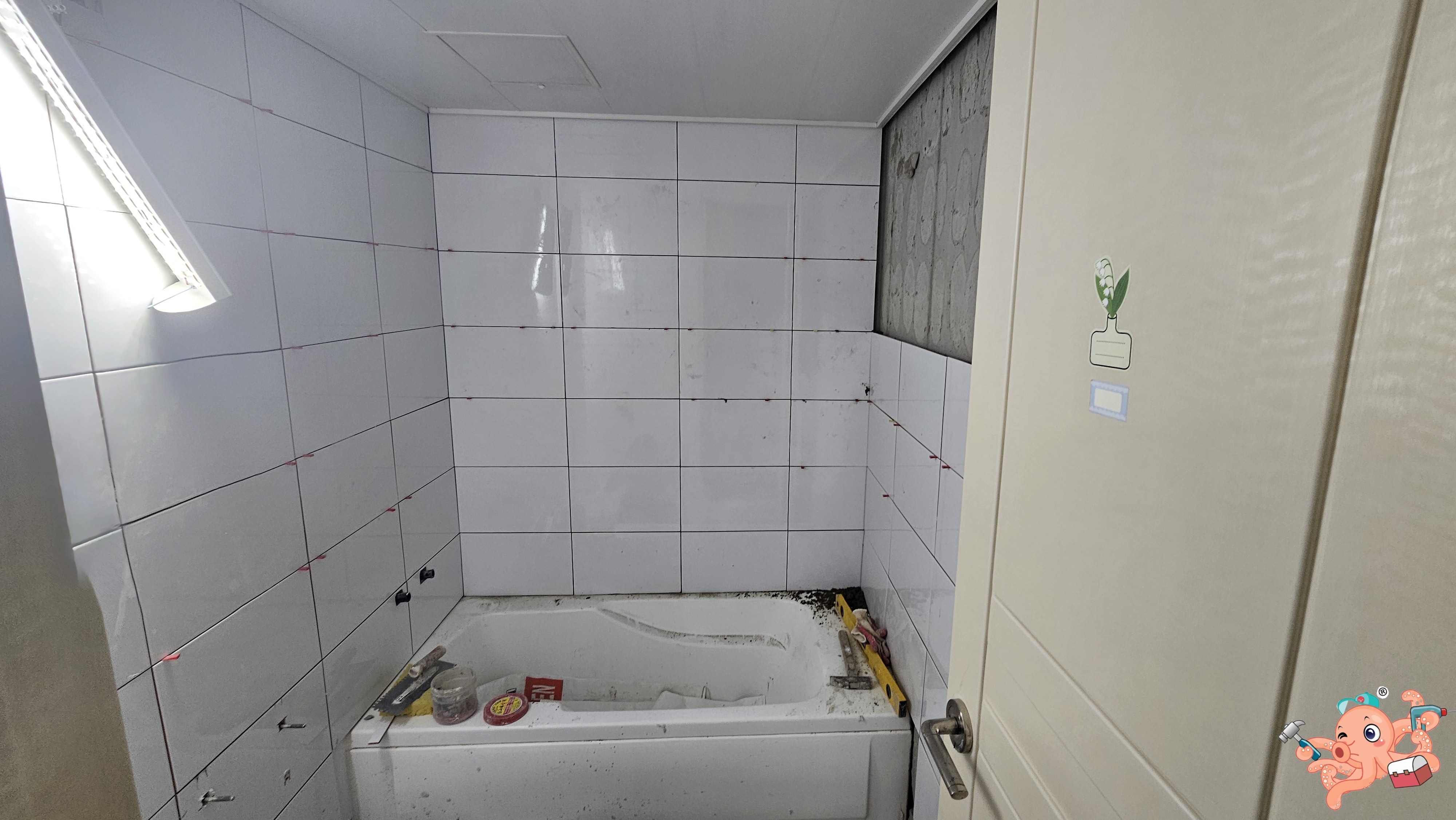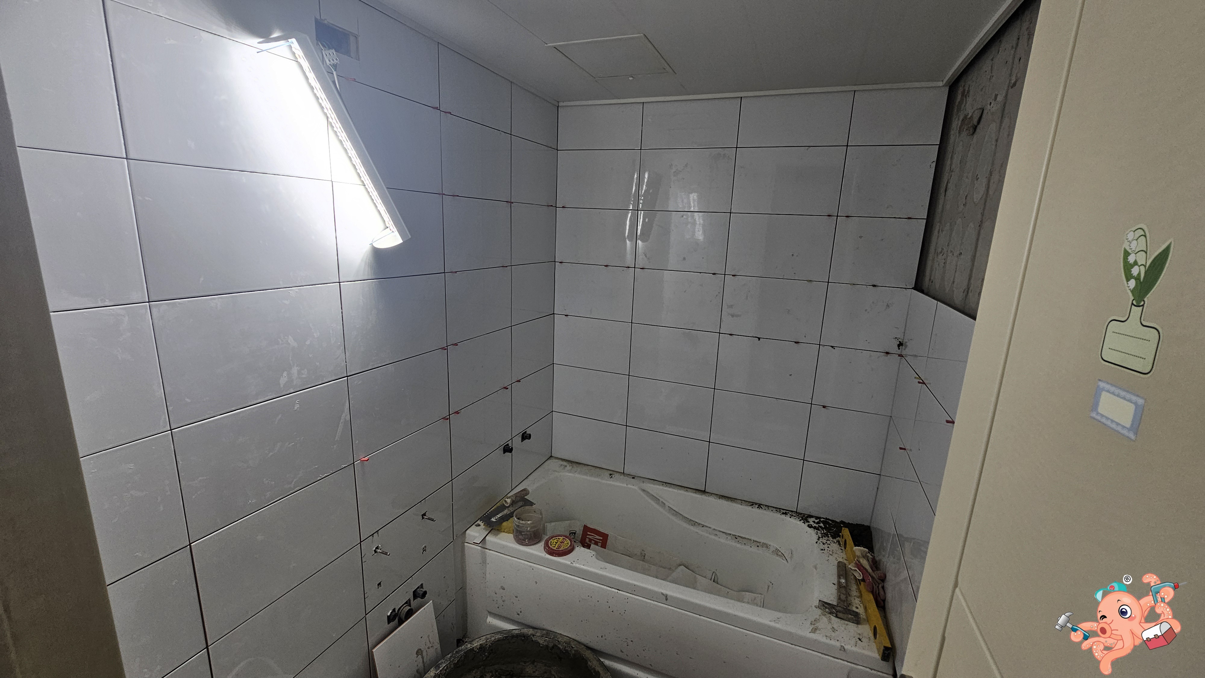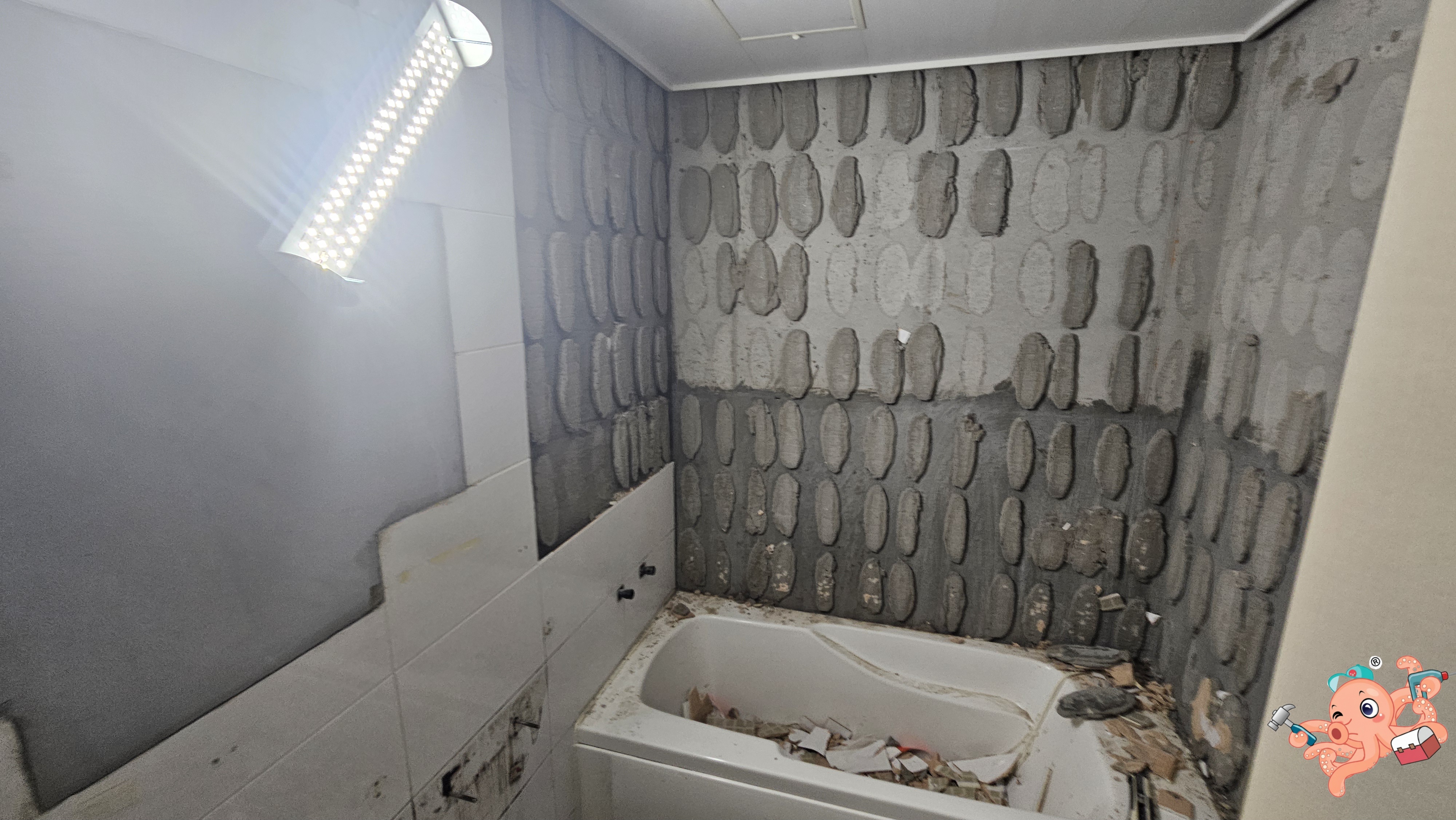 옥토바스 장군은 욕실에 들어서자마자, 지체 없이 '공간 차단술(보양작업)'을 펼쳐 먼지와 소음이 집안으로 퍼지는 것을 막았다. 그리고 가장 먼저 적의 수괴(首魁), 즉 배부르고 금 간 타일들을 향해 강력한 일격(초강력 해머)을 가했다.