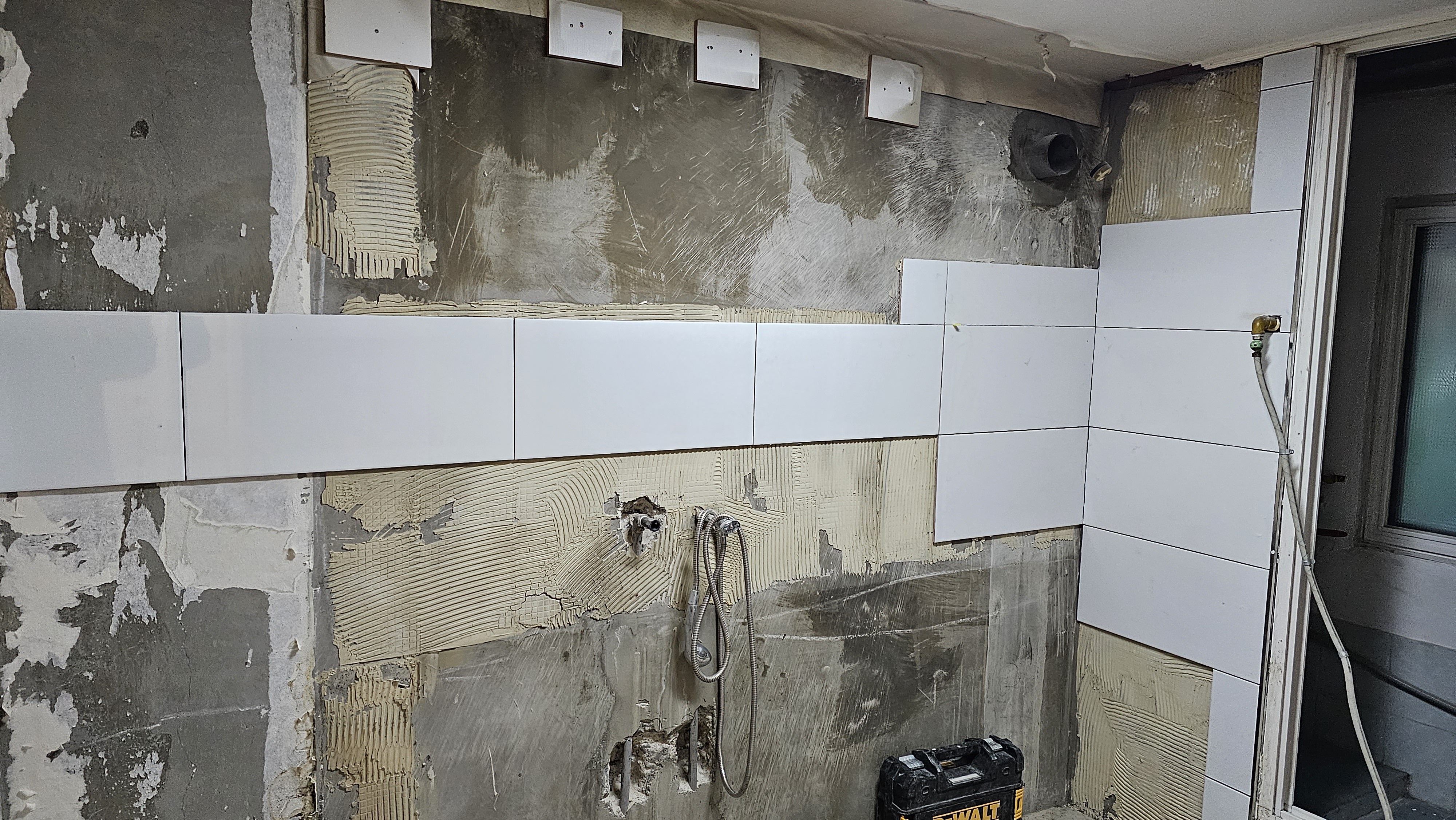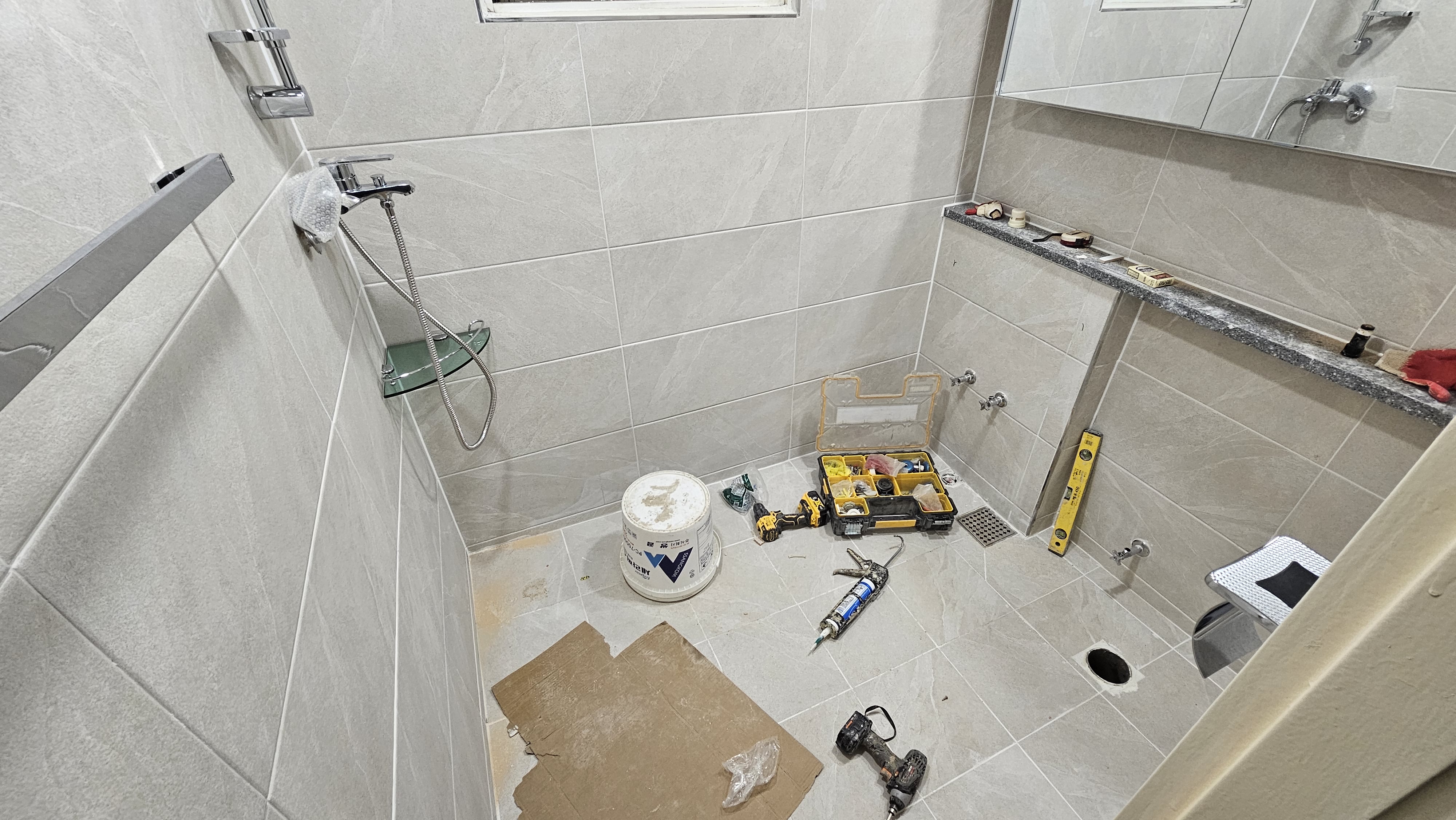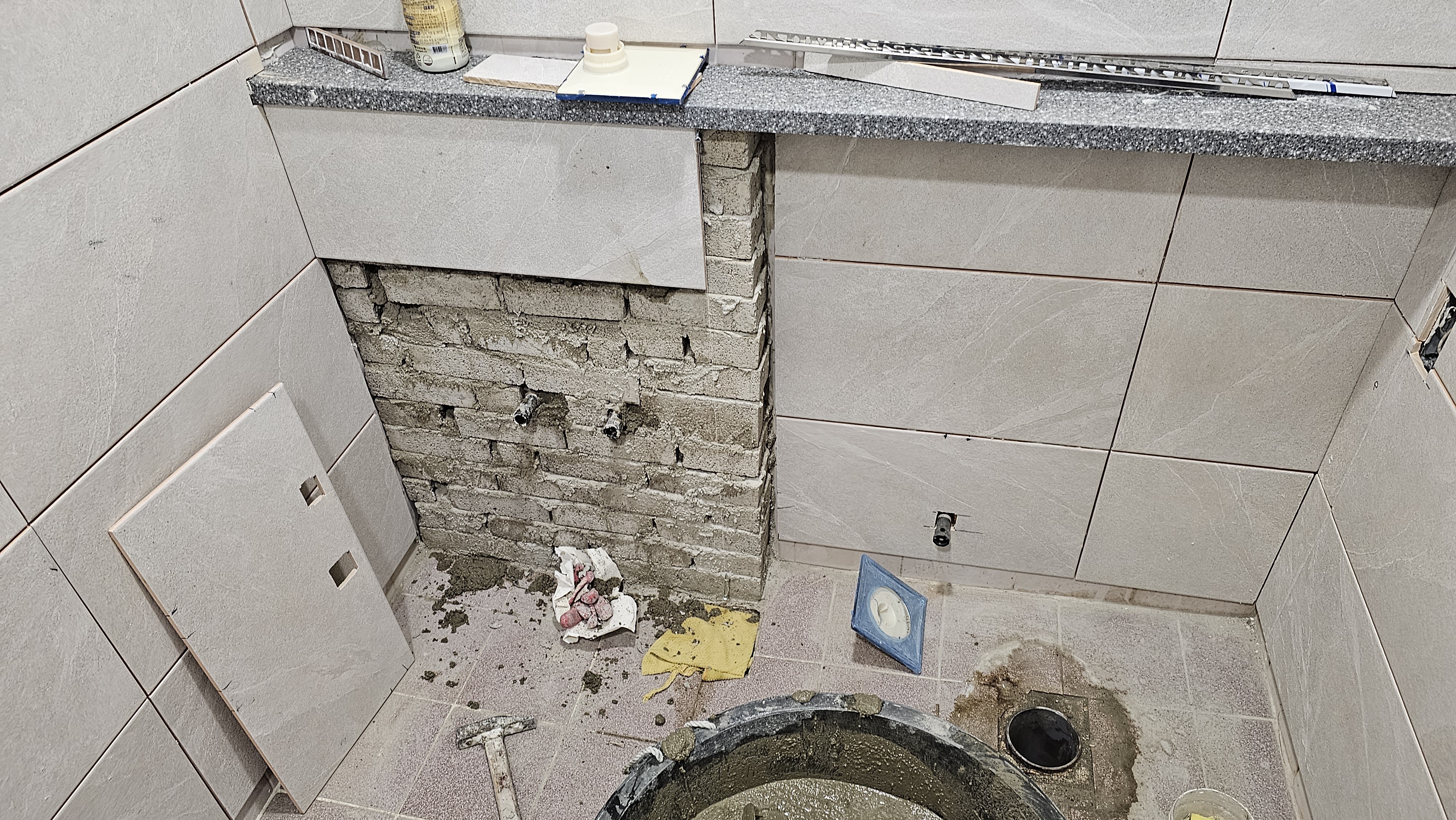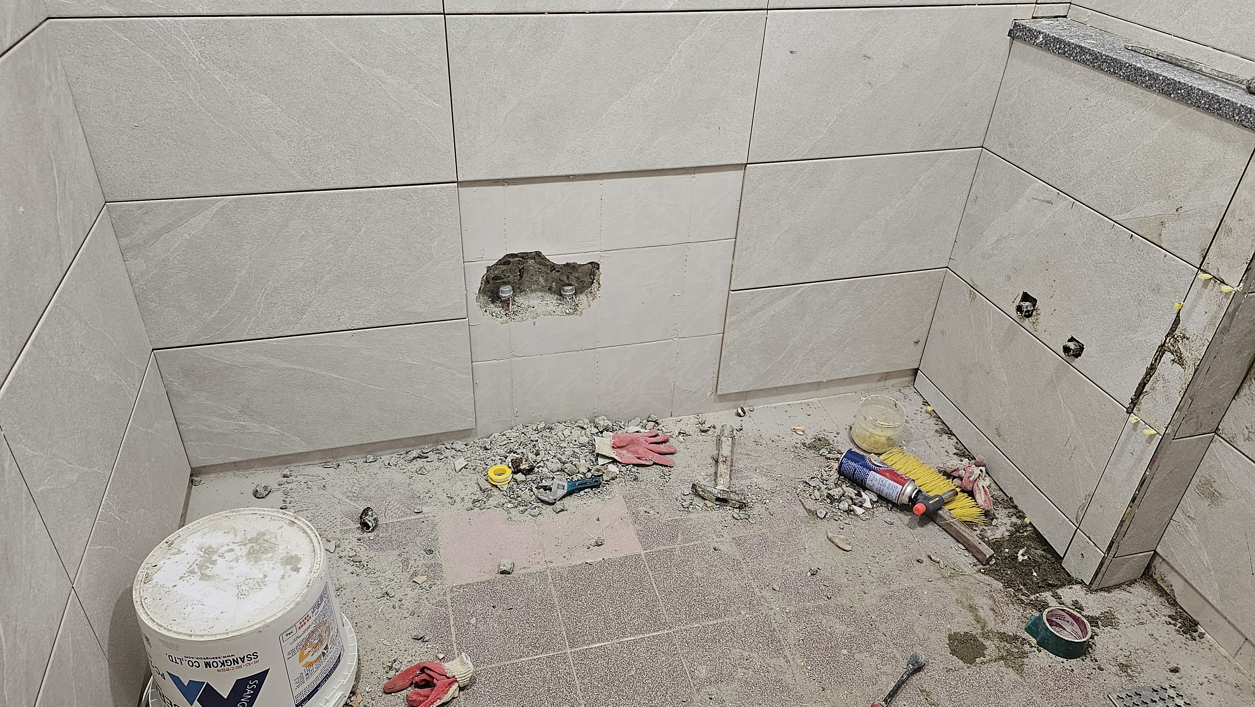 욕실의 안위와 편위를 위해 '젠다이' 성벽을 쌓아 올렸다 벽돌 한 장 한 장에 내공을 실어 미장 하니 세면대 받칠 그 기세가 **태산북두(泰山北斗)**와 같았다. 냉 온수 배관을 새로이 정렬하고 불필요한 배관은 과감히 죽여 기의 흐름을 정돈하니 공간에 활력이 돌기 시작했다. 흥흥