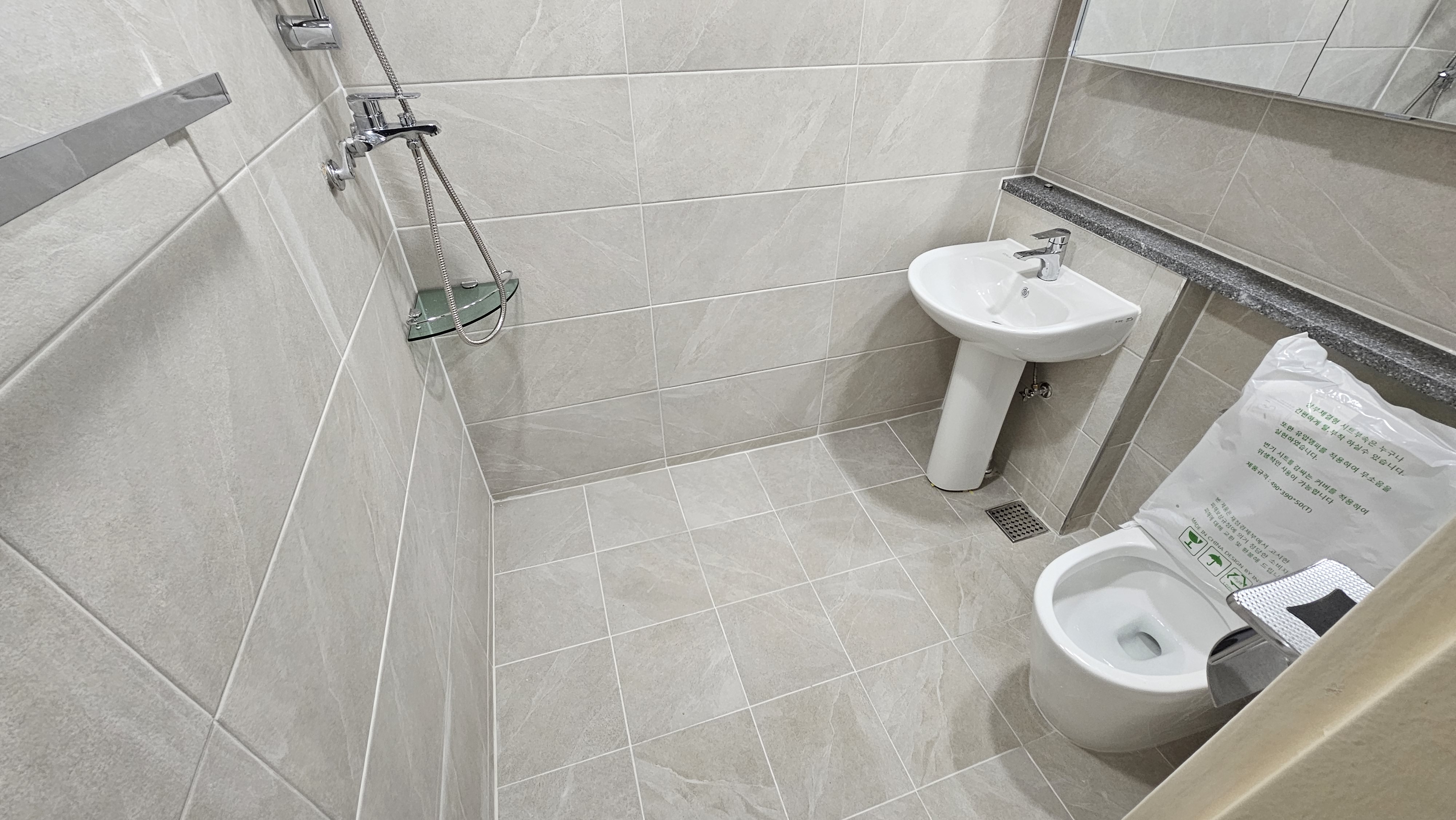타일의 향연이 끝나자 잉크도 안 마른 "신삥(新兵)' 기구들이 전면에 배치되었다. 흥흥 빛나는 수전과 정갈한 도기들이 자리를 잡고, 주방 벽면에 역시 눈부신 백색(白色) 타일로 단장하니 가희 **금상첨화(錦上添花)**였다. 흥흥