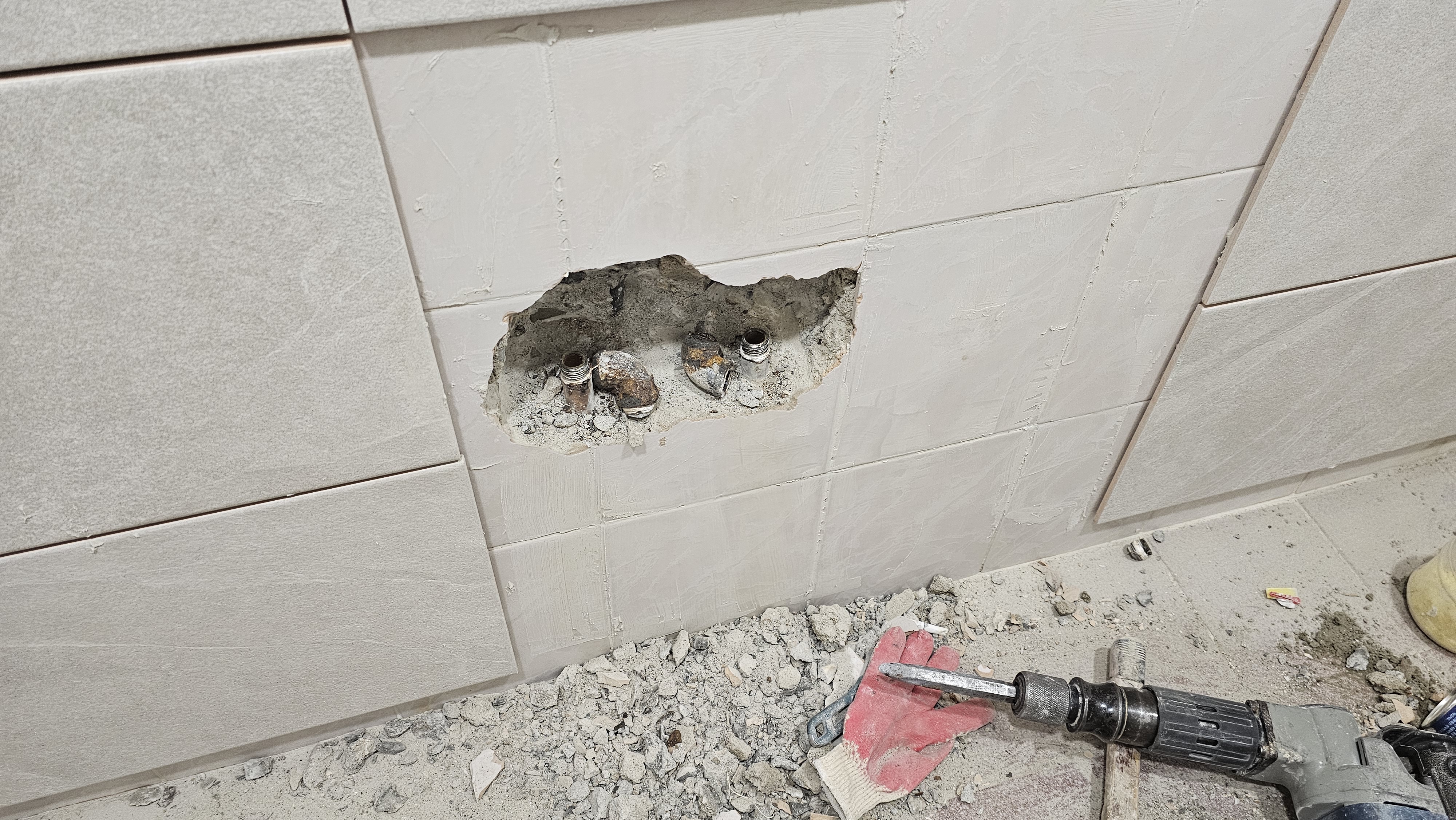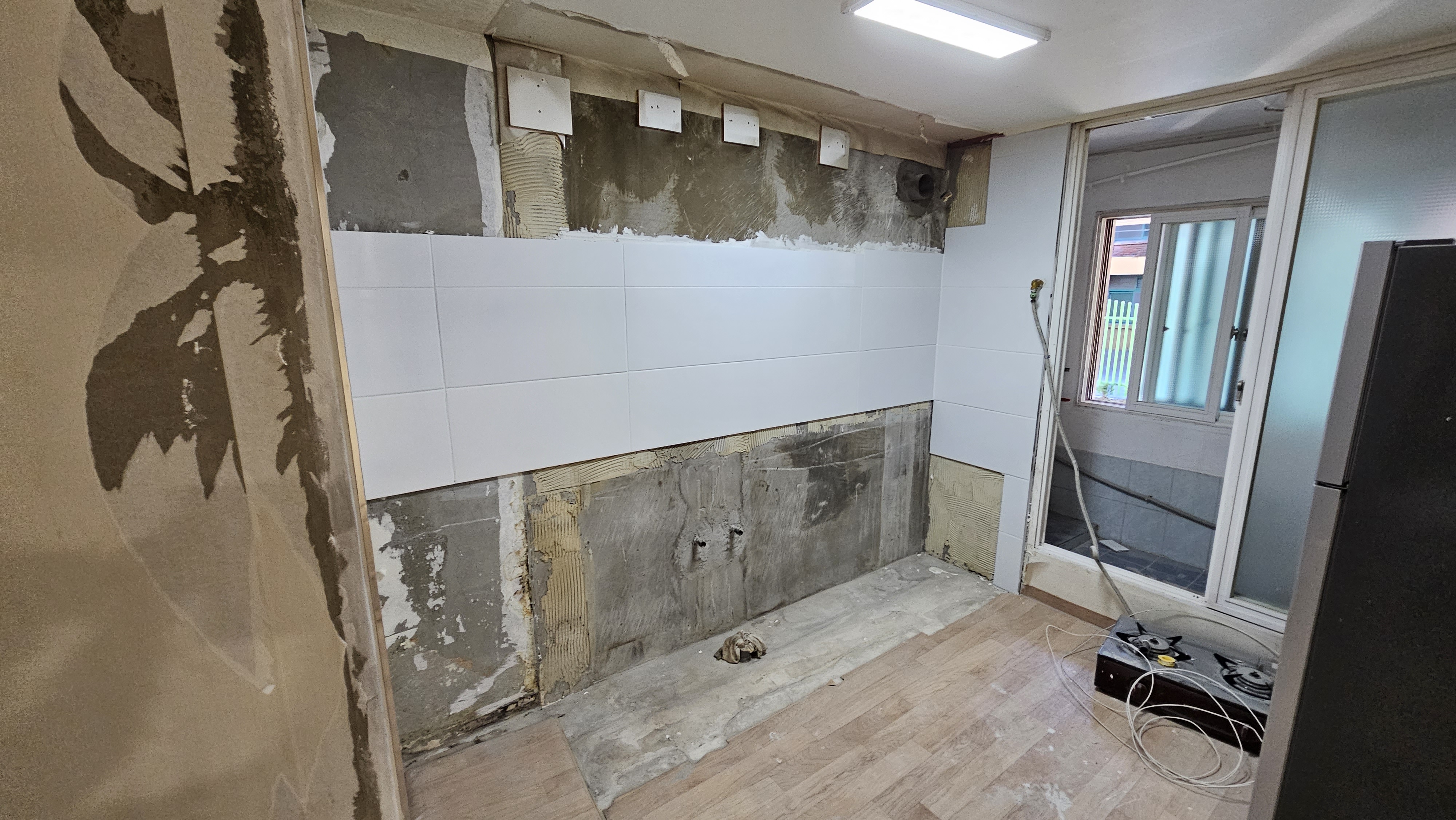 장군의 호령에 전장이 진동하며 천장(天障) 철거가 시작 되었다! 위태롭게 머리 위를 누르던 낡은 천장을 완전히 털어내니 비로소 공간의 숨통이 트였다. 흥흥 주방에서도 벽 위로 흉하게 솟아 사용자의 기를 꺽던 수전 배관을 도려내어 아래로 매립하는 **수전내림**의 비책을 펼쳤다. 이는 장군의 치밀한 포석이었으니, 훗날 들어설 주방의 심장을 위한 기초였다. 흥흥