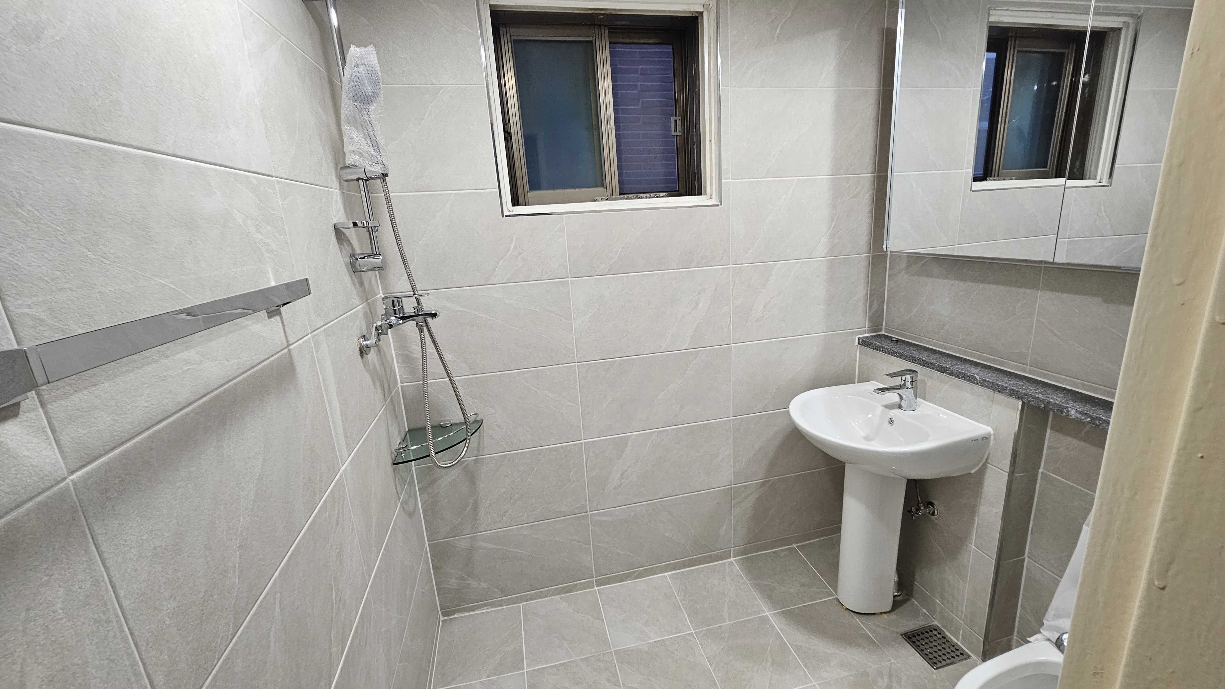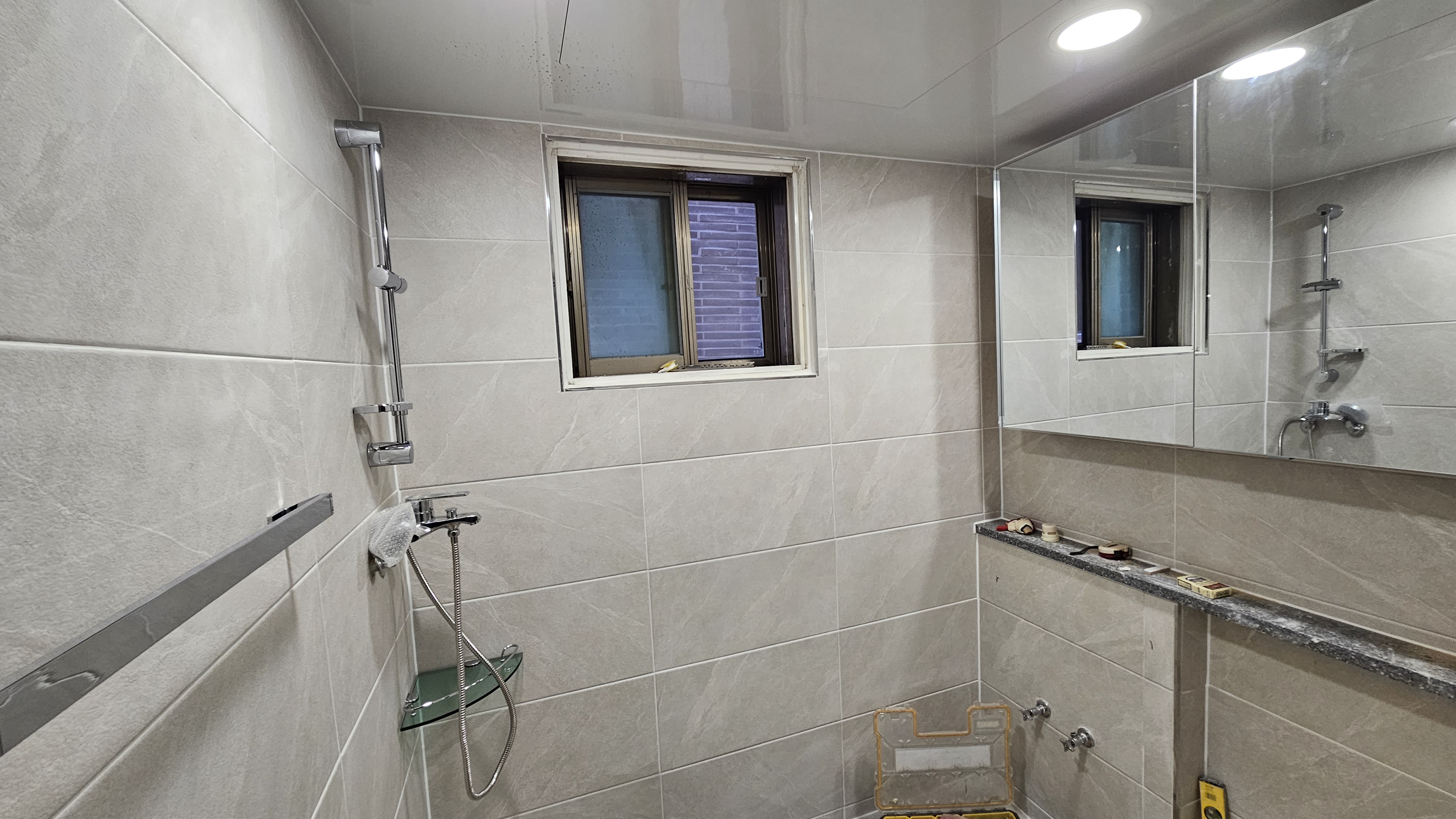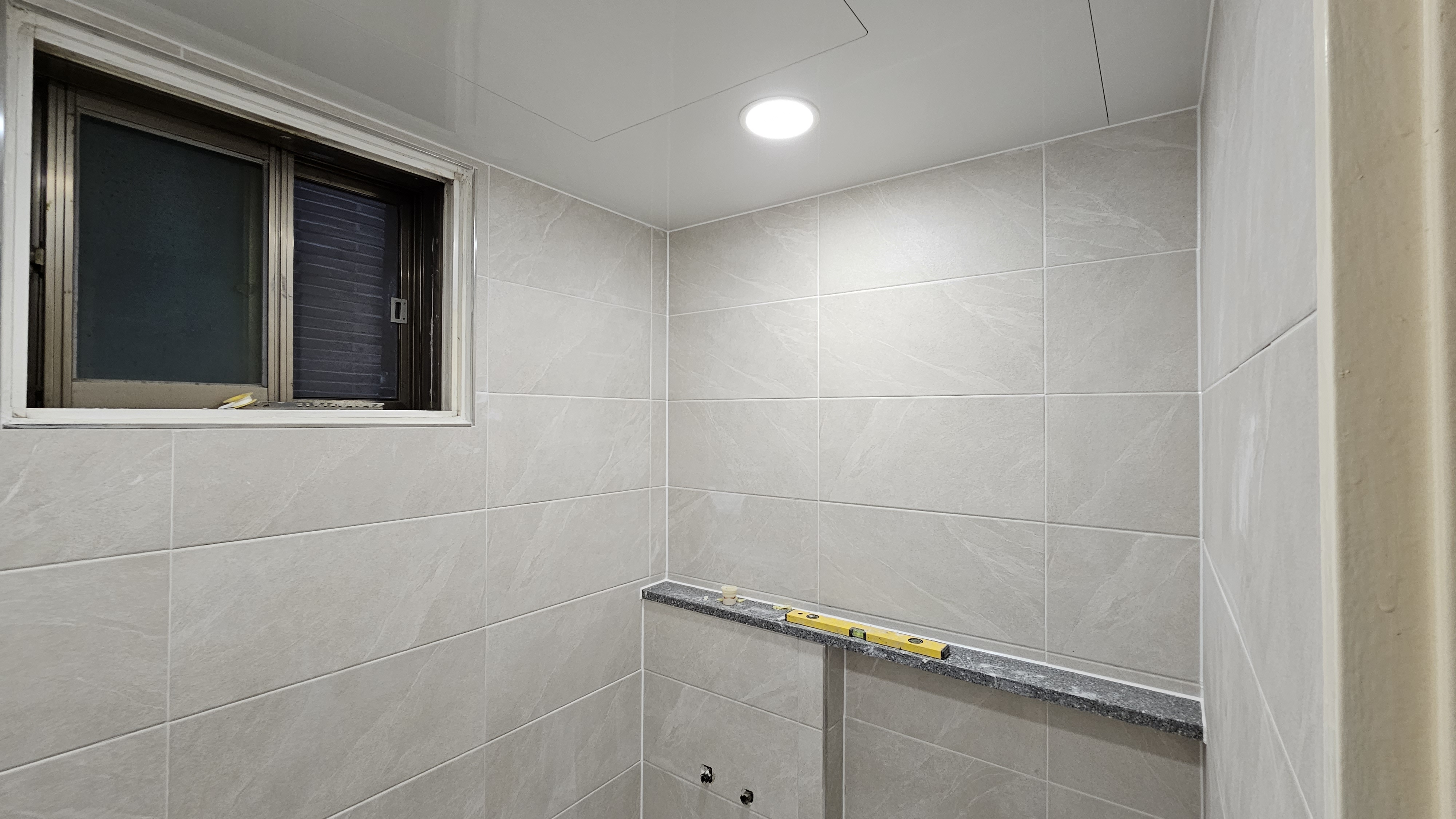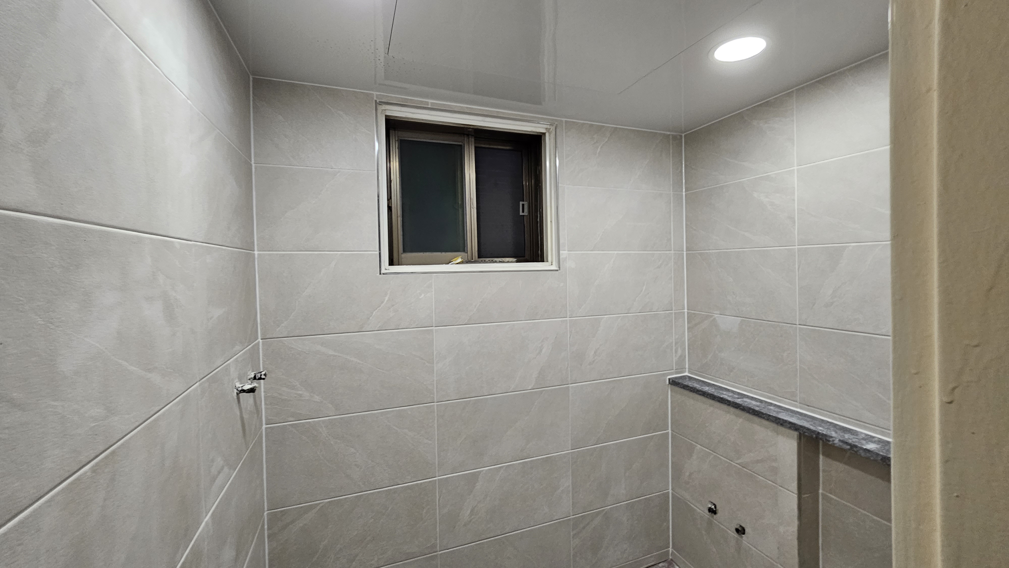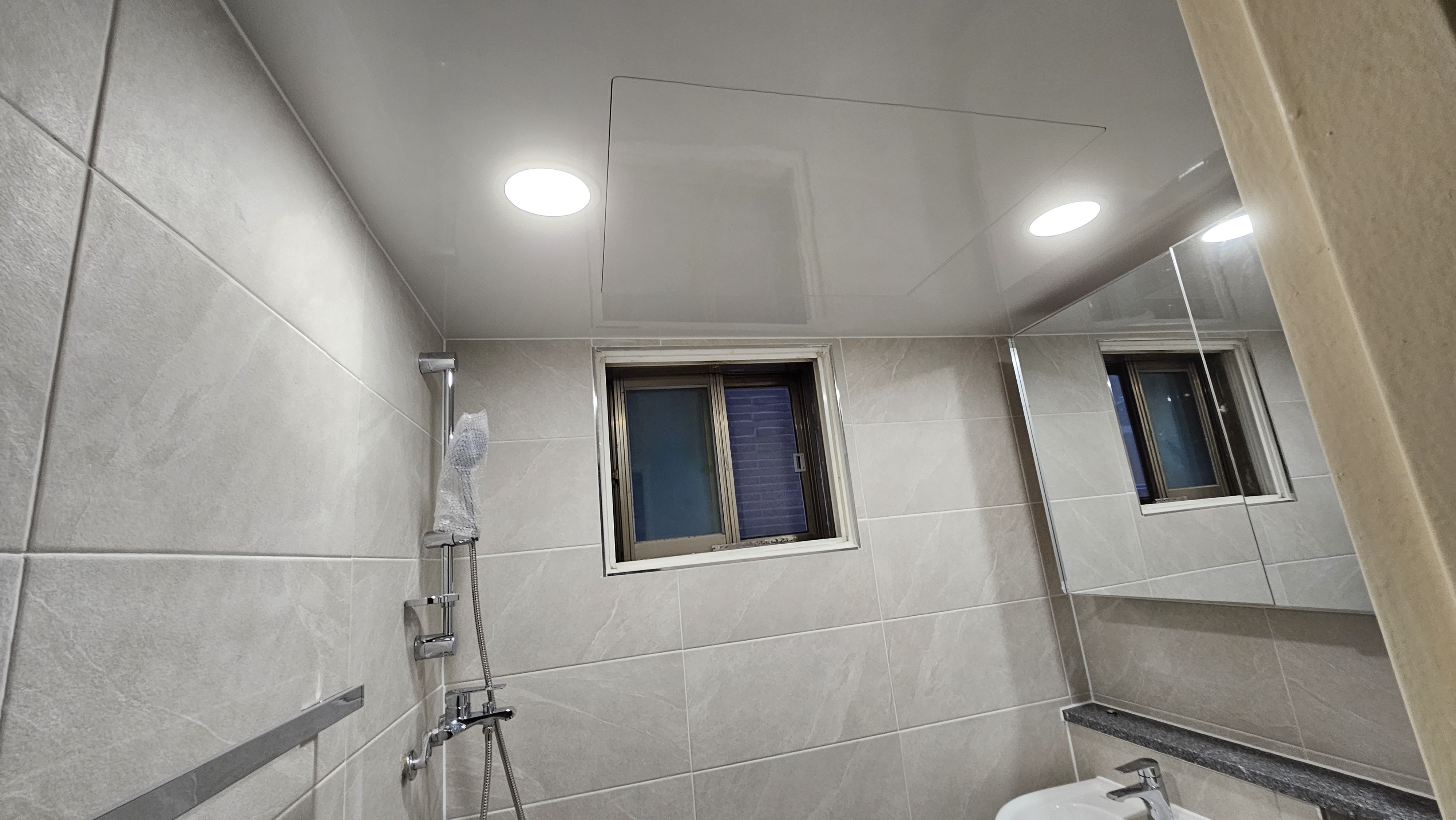 2. 욕실 평천장(平天障): 털어낸 천장 자리에 매끈하고 높은 평천장을 올렸다. 흥흥 벽타일 끝단까지 시원하게 뻗은 평천장은 욕실을 더욱 넓고 웅장하게 보이게 하는 장군마의 혜안(慧眼)이었다. 흥흥