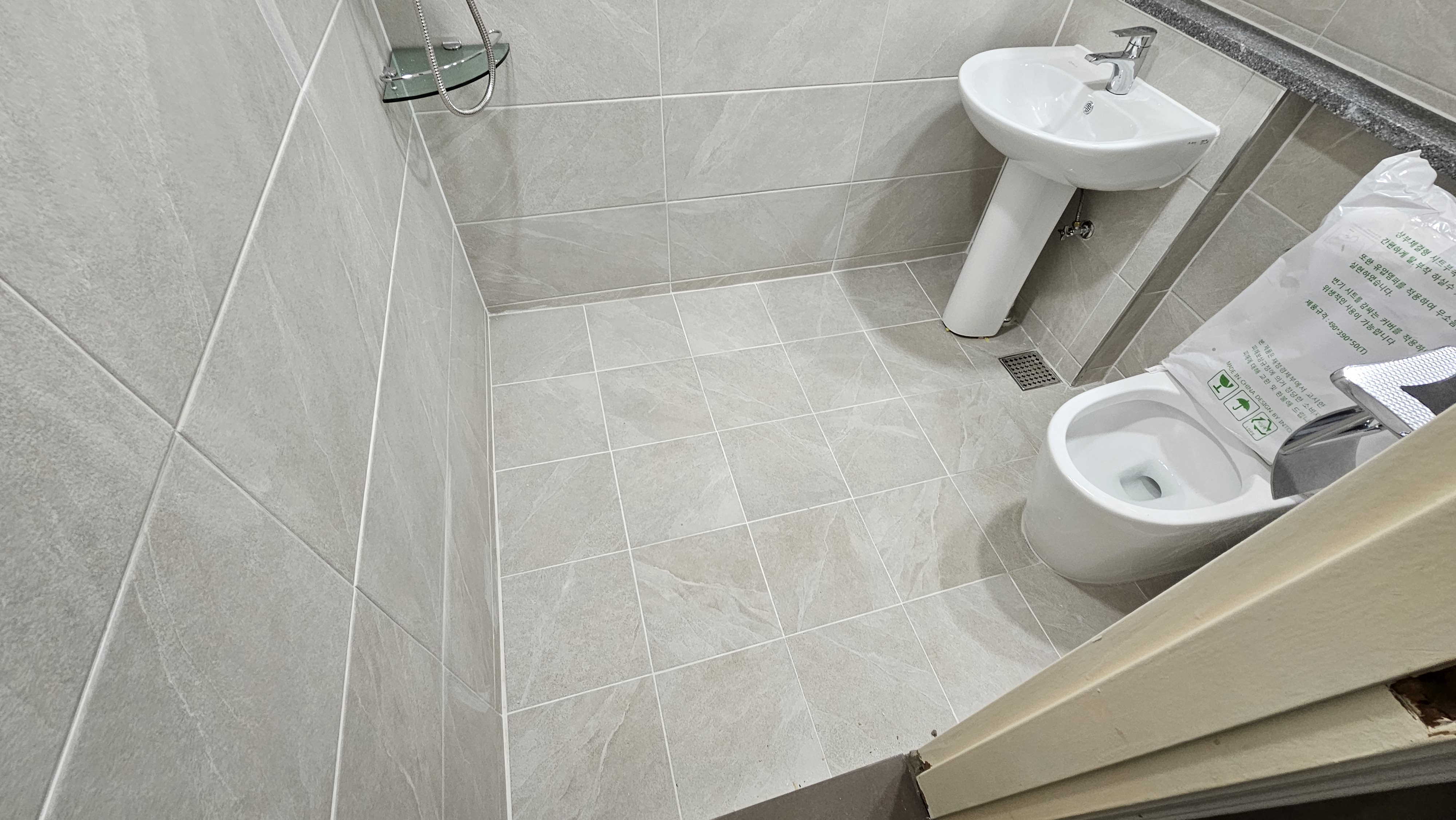 · 벽면 본드발이: 욕실 벽면은 정교한 본드 시공으로 타일을 한 치 오차 없이 밀착시켰다. 흥흥 이는 마치 장수의 몸에 딱 맞는 갑옷을 입히는 것과 같았다 (쌍곰이네 본드) 흥흥