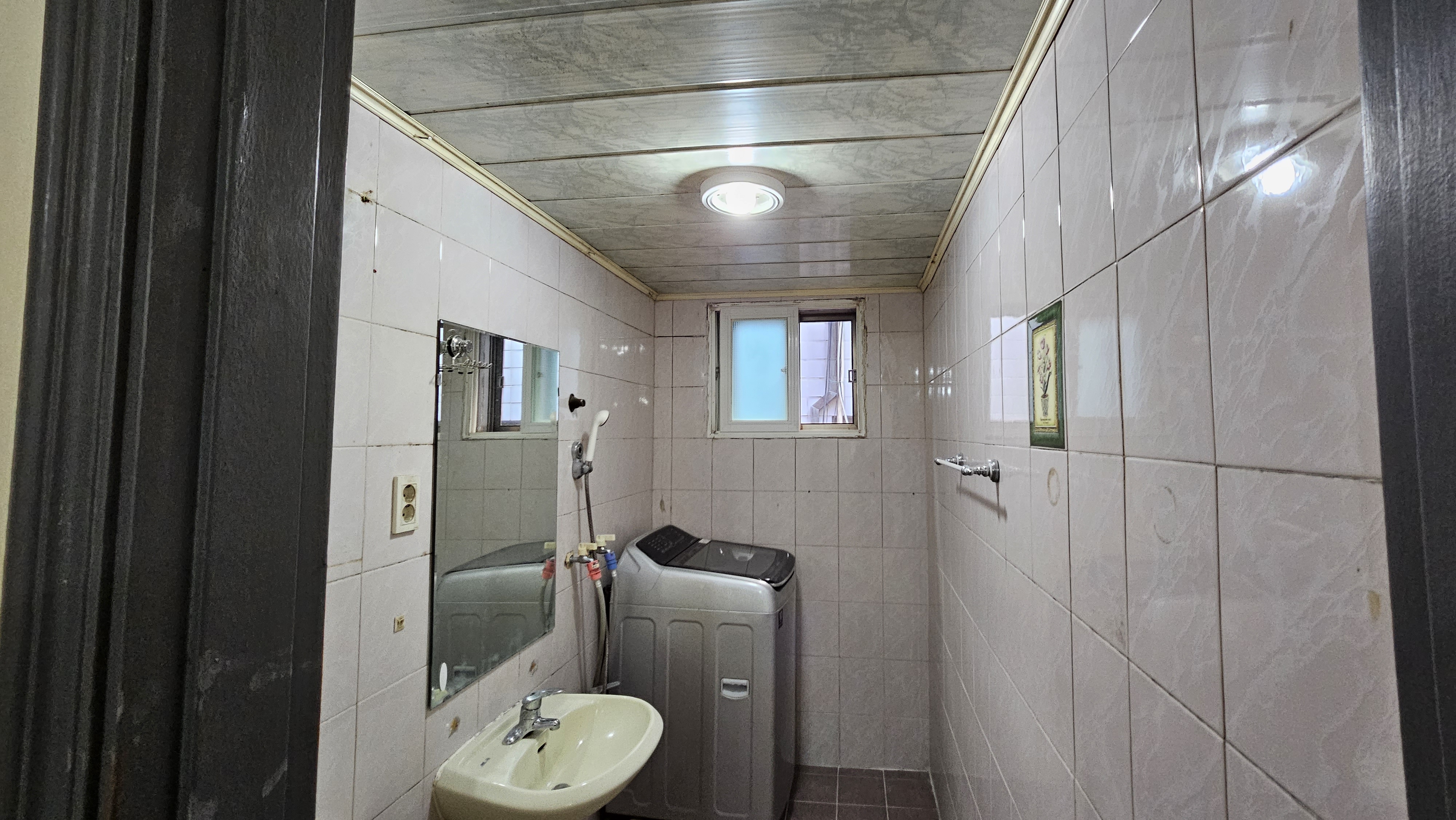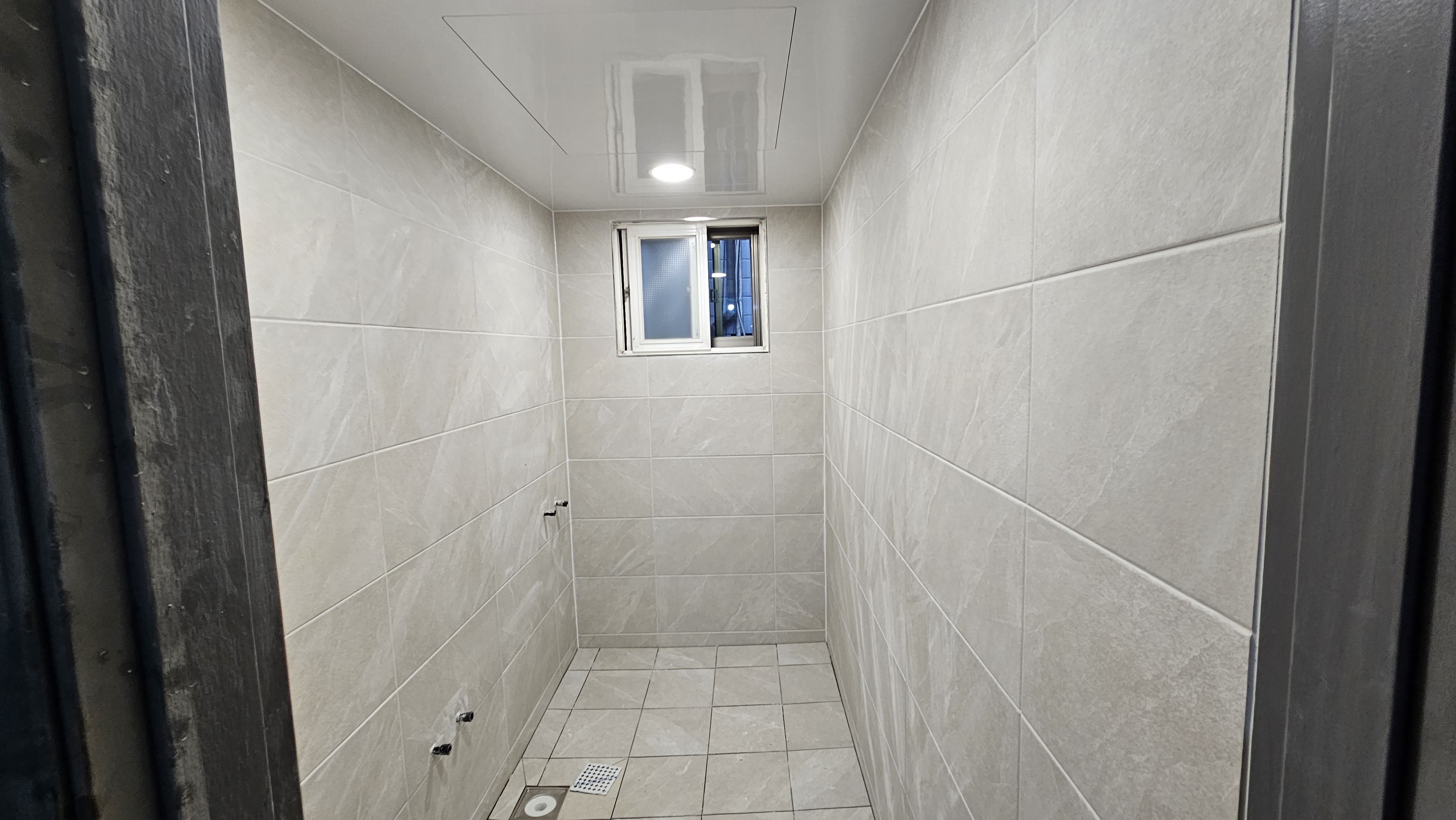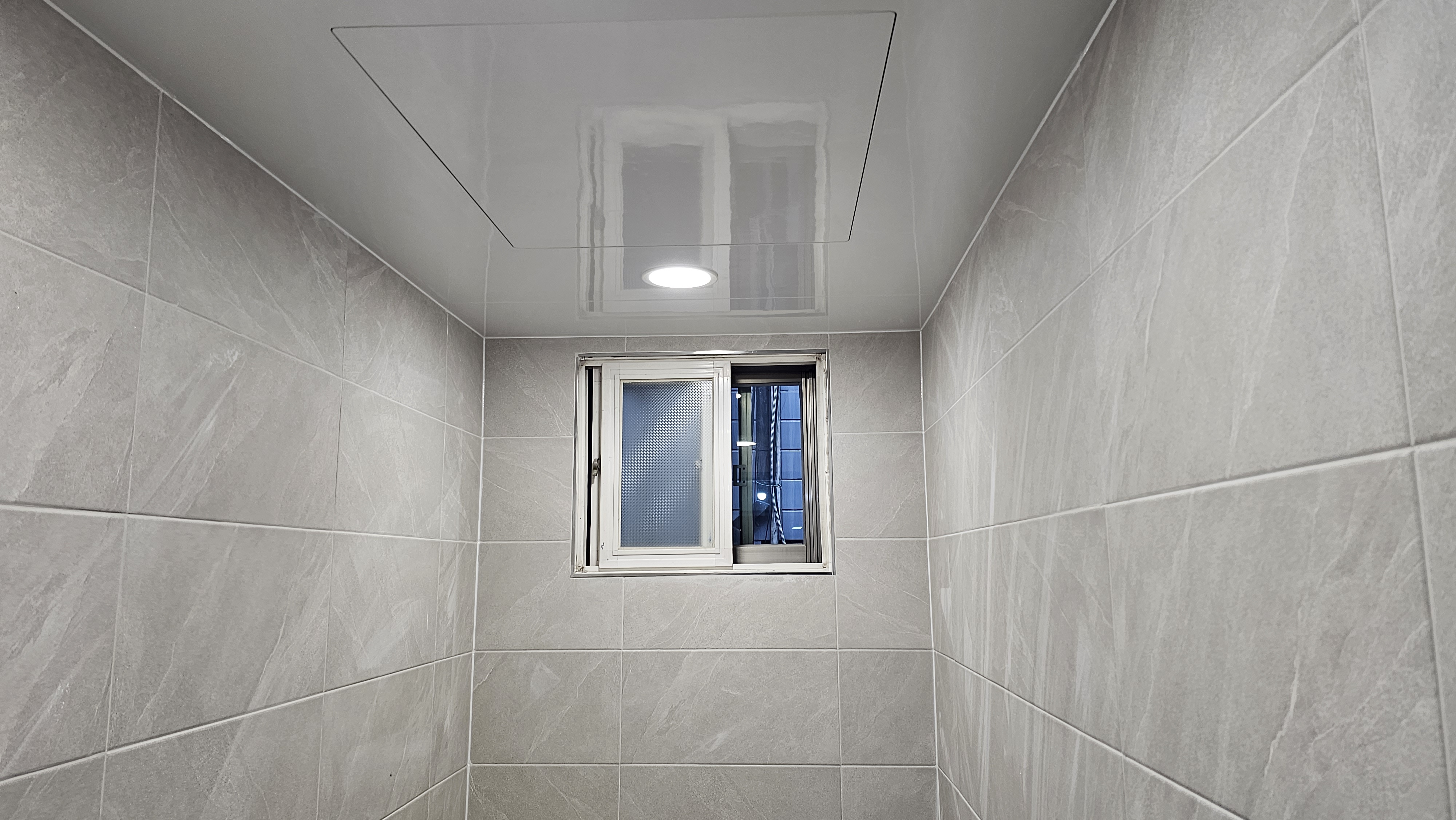 어수선했던 천장을 깔끔한 **평천장(平天障)으로 교체했소. 시야가 확 트이니 공간이 훨씬 넓어 보이고 세련된 느낌이 드는 것이, 마치 구름 위를 걷는 기분이 들게 만들었지. 흥흥 천장에 심어진 환한 매립 조명은 서초동 앞마당에 달빛이 내려앉은 듯 은은하고 기품 있는 분위기를 자아내오. 평천장은 욕실을 더 높고 넓게 보이게 하는 마법과도 같아, 들어서는 이마다 감탄을 금치 못할 것이오. 흥흥