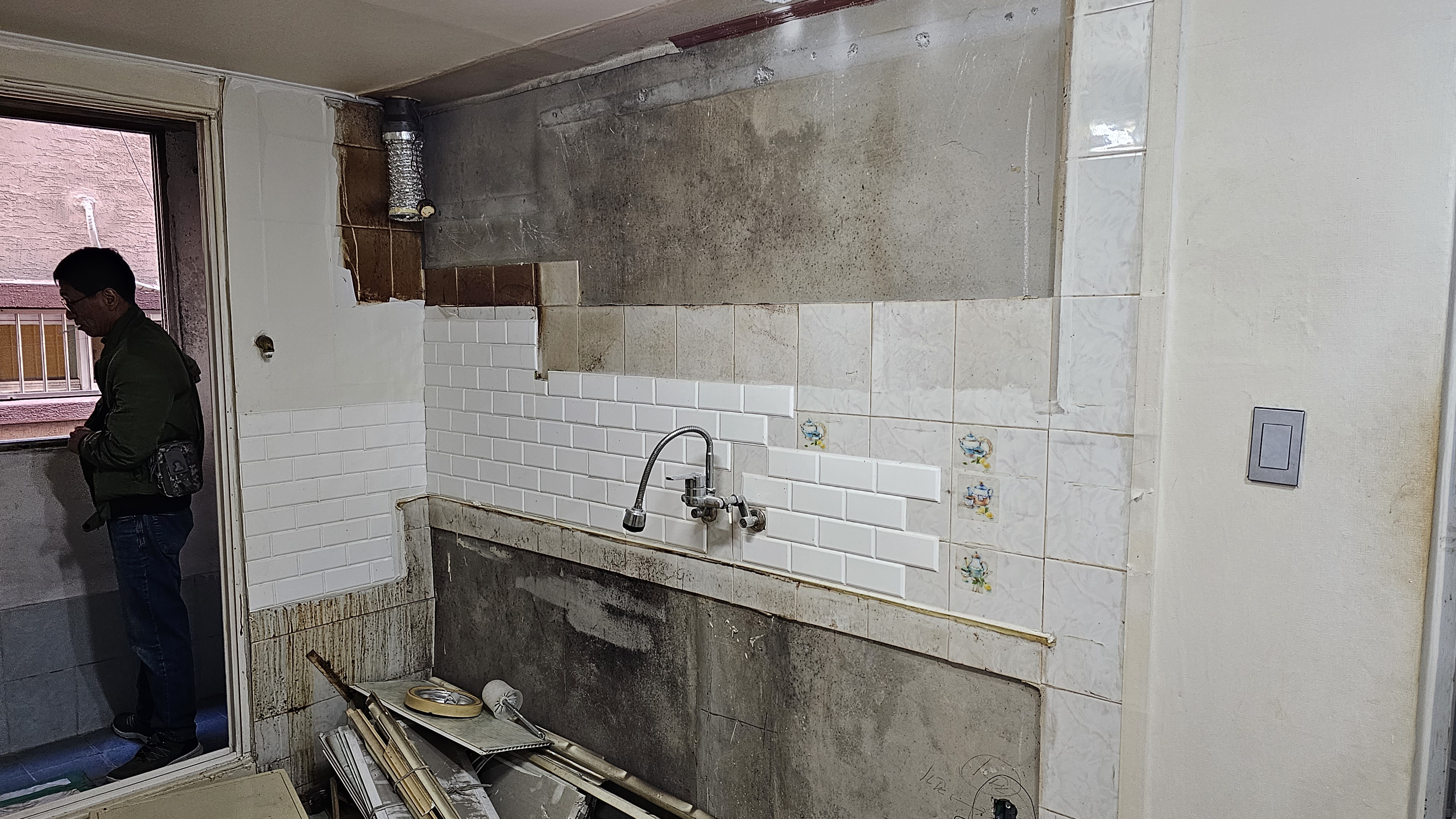 주방은 먹거리를 만드는 곳이니 청결과 조화가 생명이오. 흥흥 그런데 서초동 앞집 주방은 낡은 타일들이 덕지덕지 붙어 기운을 막고 있었지, 본 장군, 지체 없이 타일 철거(撤去) 명령을 내렸소! 흥흥