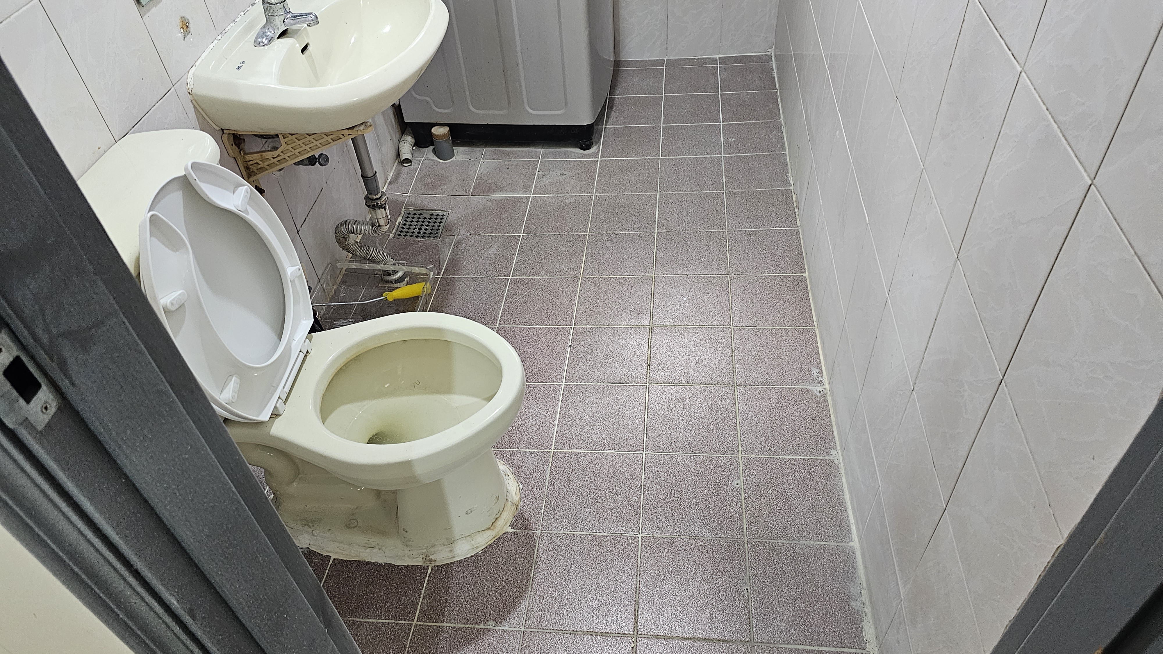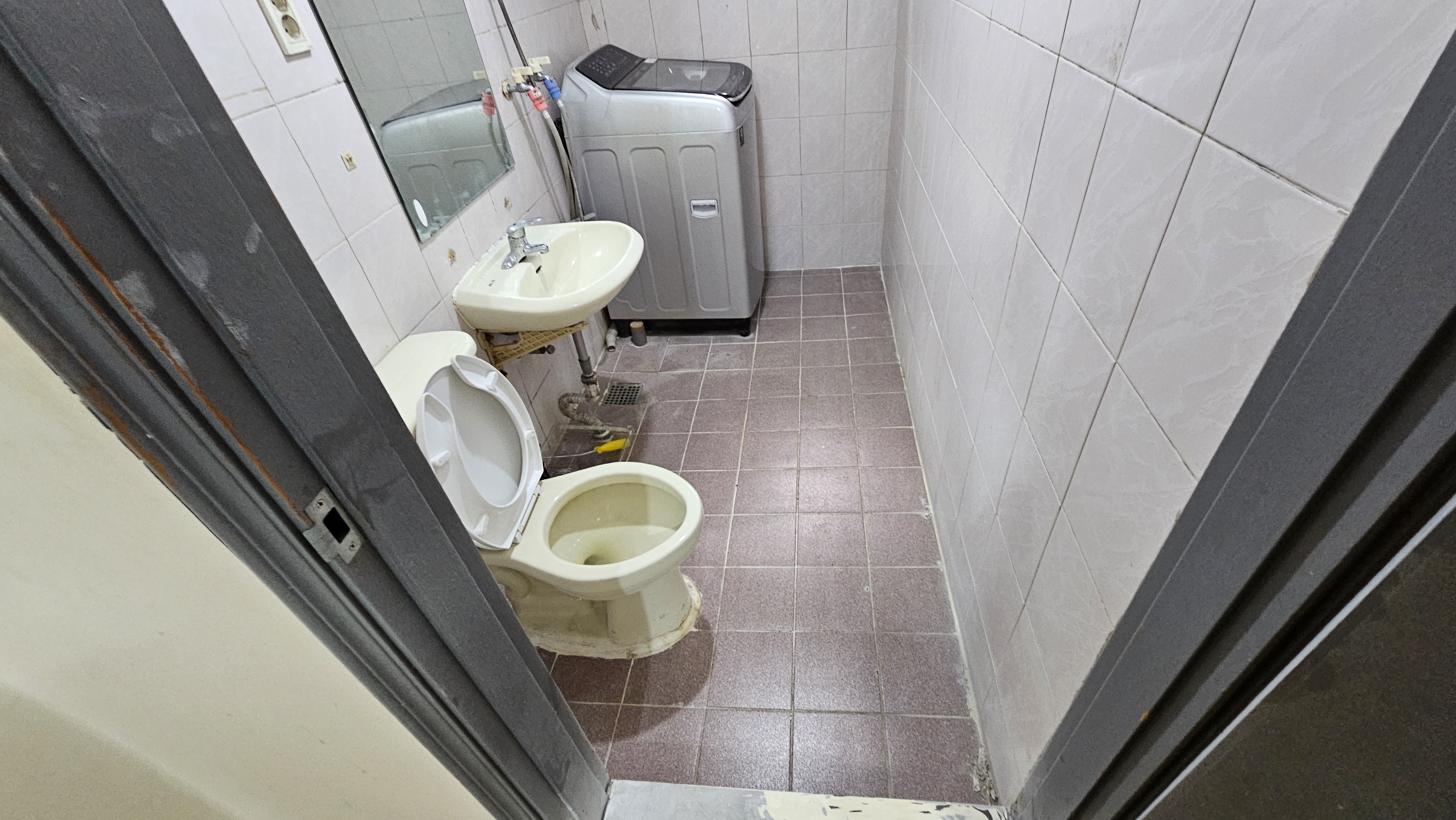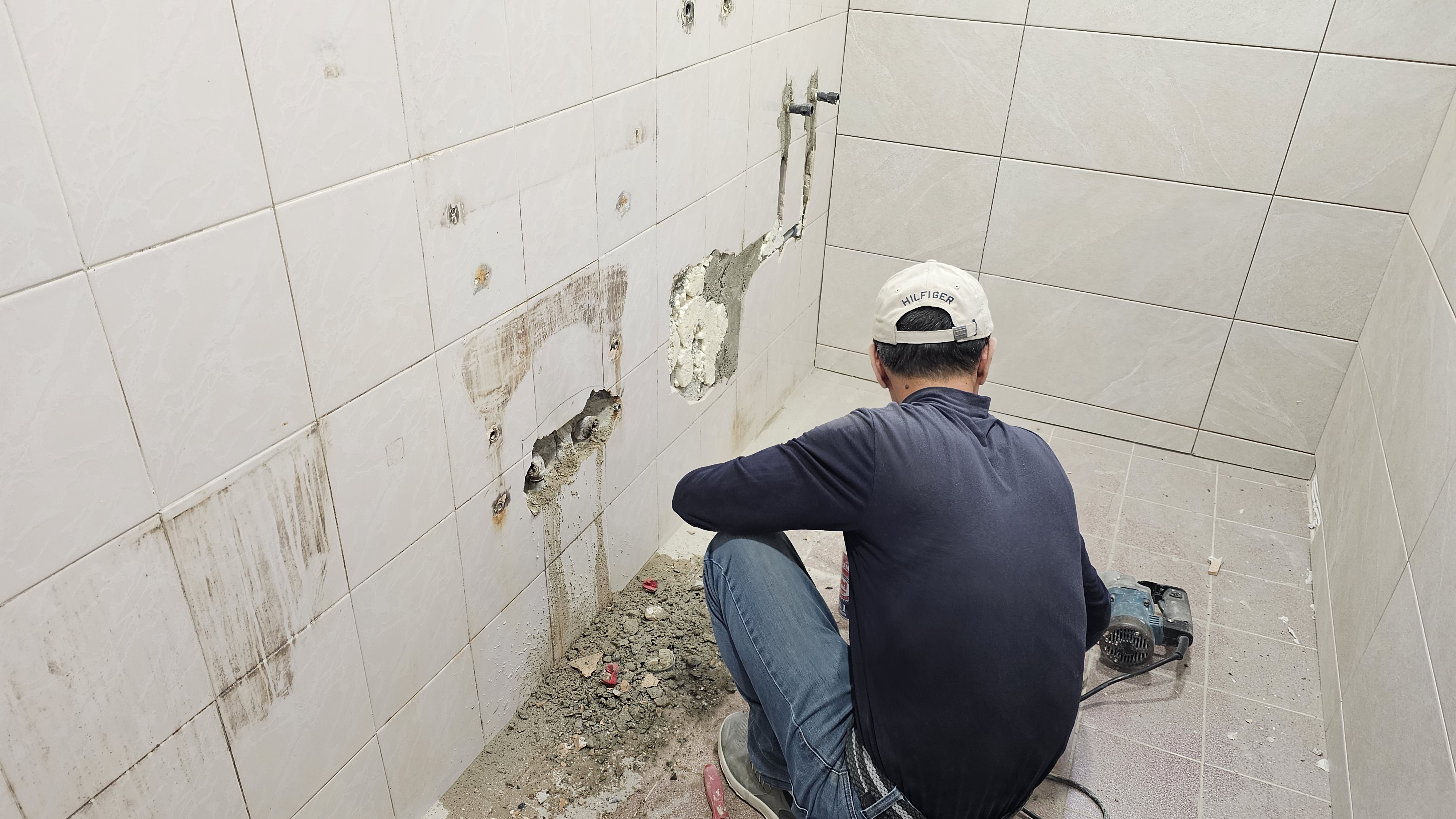 기존의 낡은 타일들을 모두 털어내어 민낯을 드러냈소. **온고지신(溫故知新)**이라 했거늘, 낡은 것을 과감히 버려야 새것이 들어오는 법! 타일을 털어낼 때 발생하는 먼지 하나하나까지 본 장군의 기개로 다스렸소. 뿌리부터 새로 시작해야 진정한 명품이 나오는 법 아니겠소? 흥흥 털어낸 자리에 암은 요철을 고르게 고르고, 새로운 타일이 들어앉을 자리를 정무(政務)를 엄숙하게 준비했소. 흥흥
