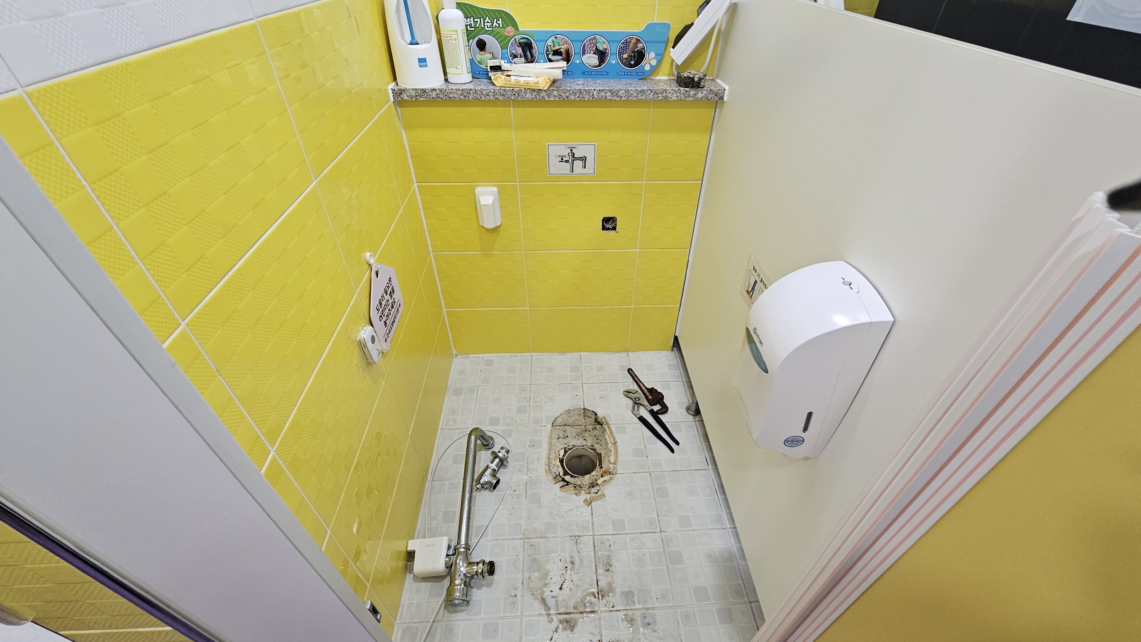 무릇 화장실이라는 공간은 인간의 근심을 덜어주는 해우소(解憂所)이거늘, 특히 어린 새싹들이 사용하는 곳은 그 어느 곳보다 청결하고 견고해야 하는 법! 본좌는 이번 전장에 임하며 단순히 변기를 갈아치우는 기술자가 아닌, 아이들의 안전과 위생을 책임지는 **수호신(守護神)**의 마음으로 청룡언월도(타일 커터)를 고쳐 잡았노라. 이번 정벌은 배관의 흐름을 바꾸고 성벽을 새로 세우는 가히 욕실 재건의 대역사(大役事)였으니, 그 상세한 비급을 이제부터 공개하노라!