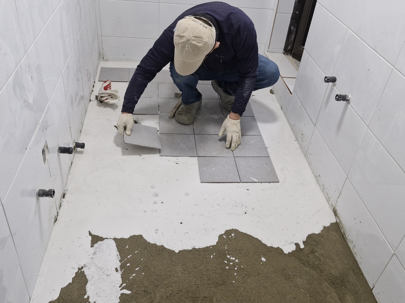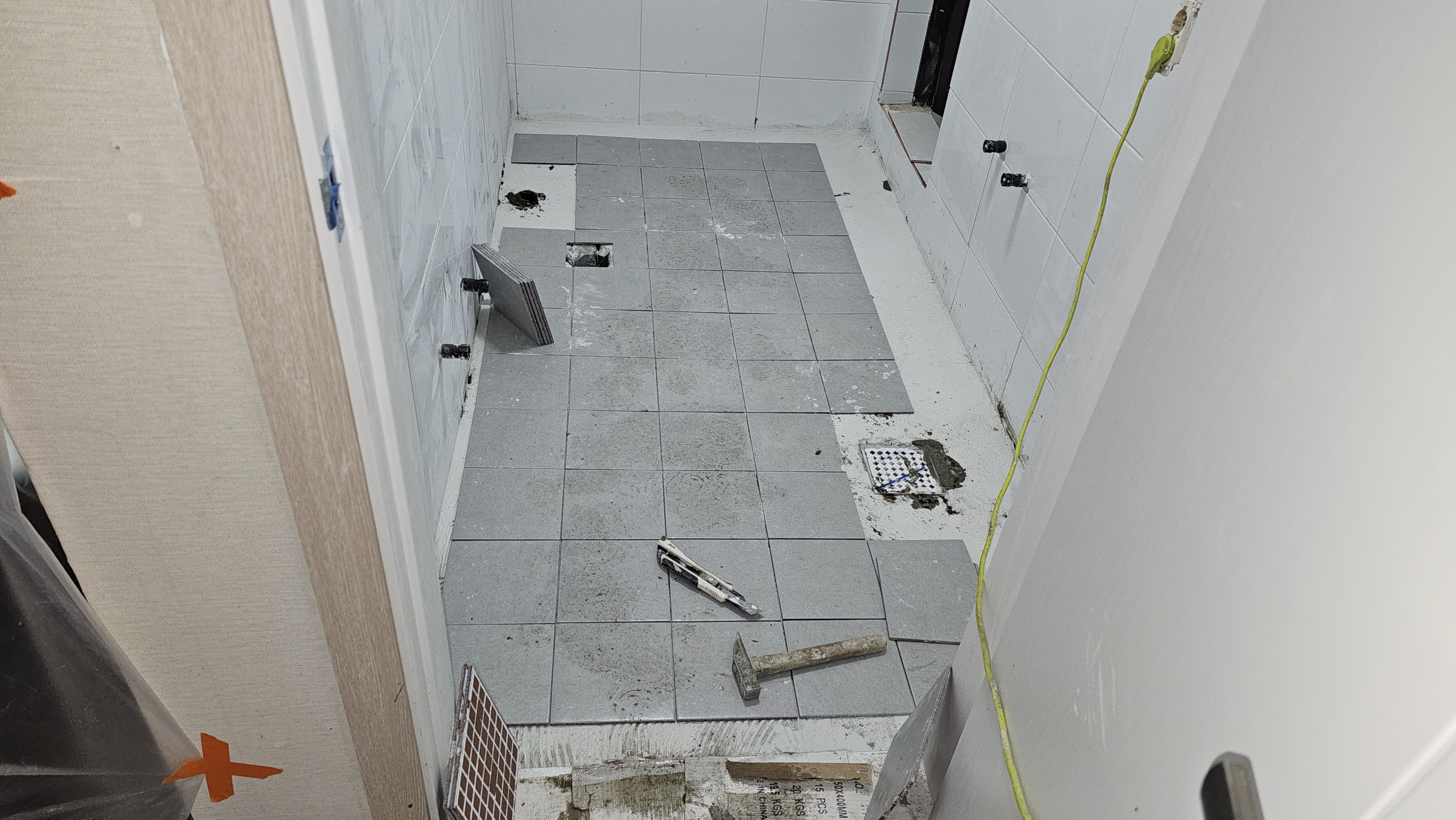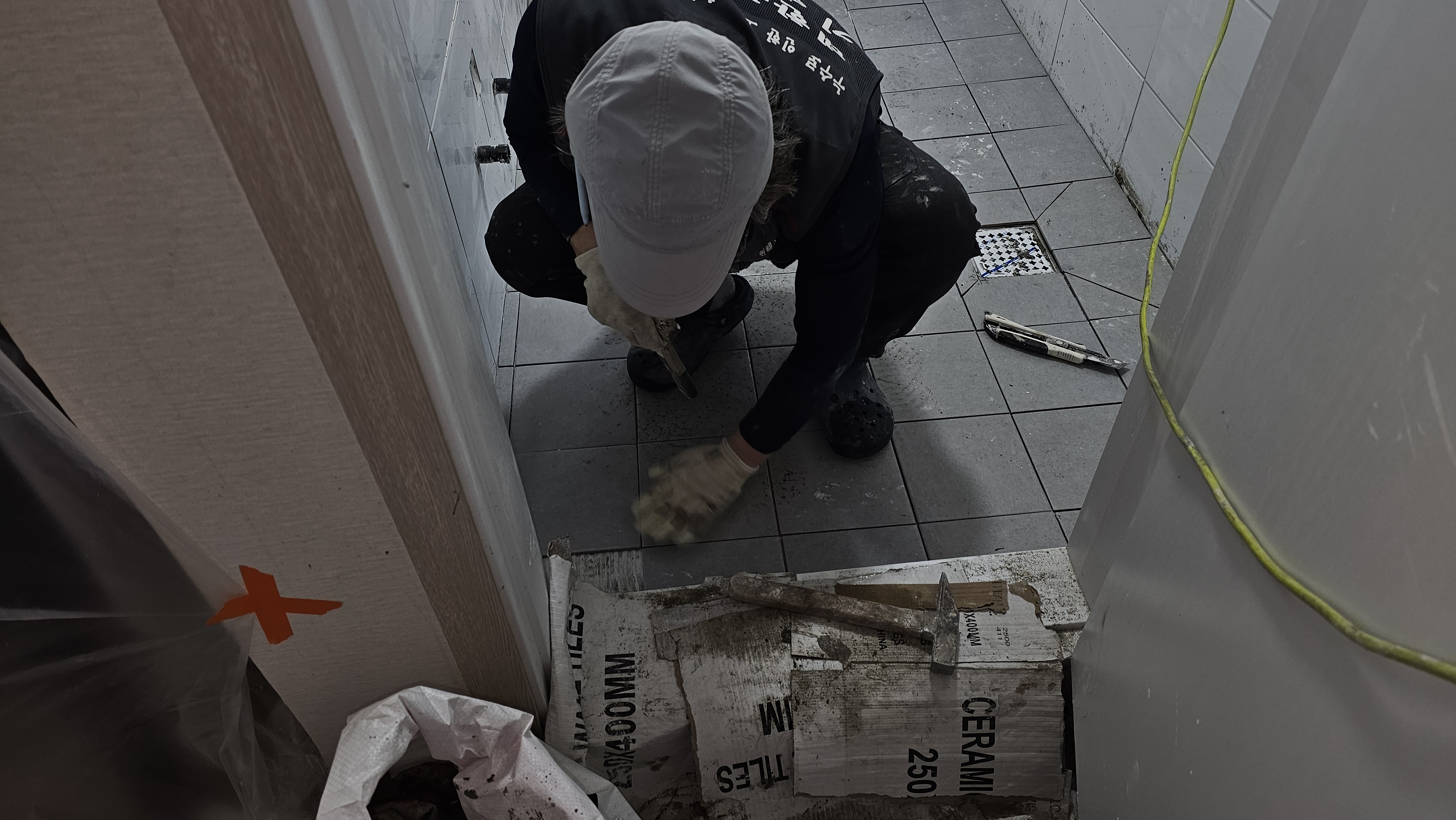 이때 장군의 손에 들린 것은 바로 20년 지기 냉가 망치였다! 강산이 두 번 변하는 세월 동안 장군과 고락을 함께해 온 이 전설의 명검이 허공을 가르며 타일을 경쾌하게 두드렸다. '텅, 텅' 소리와 함께 타일은 대지와 하나가 되었고, 미세한 단차까지 단숨에 잡아내는 그 정교함은 가히 **神技(신기)**에 가까웠다. 이어지는 바닥타일 메지 작업으로 바닥의 모든 틈을 메우니 욕실 전체에 견고한 기운이 감돌며 마침내 시공 완료의 기치가 높게 걸렸다.