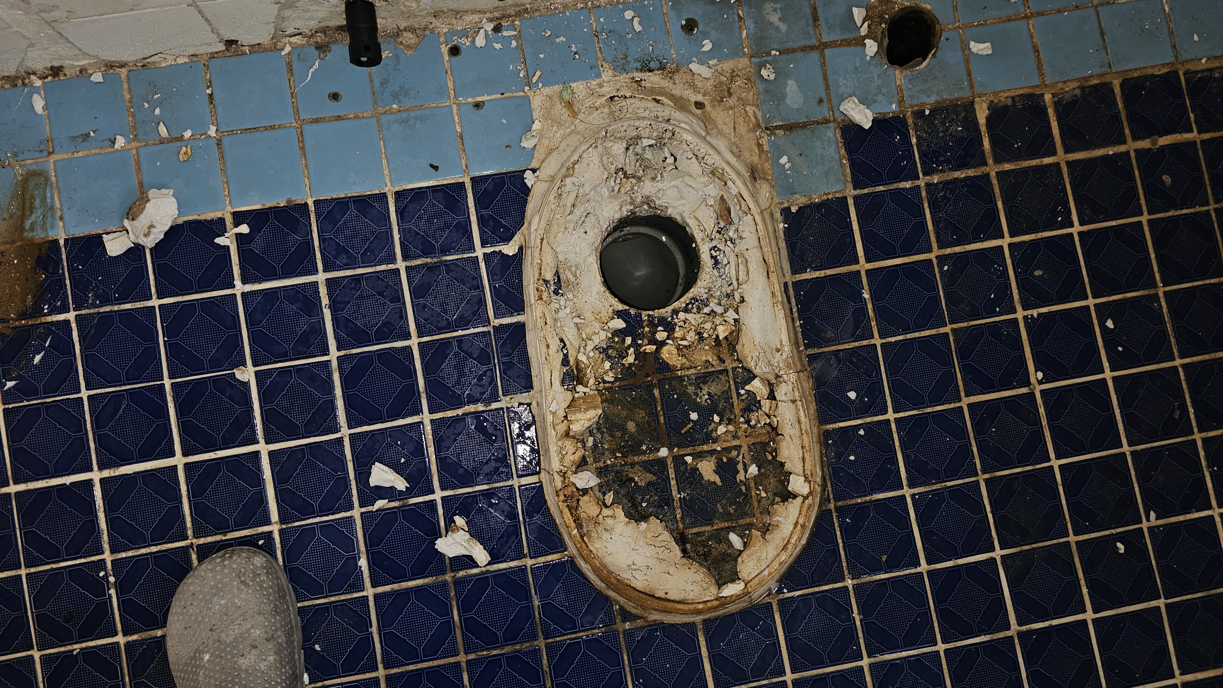 드디어 최후의 총공격, 타일 안착의 시간이 도래했다! 장군은 정성껏 조제한 백세면 노릿물을 똥바가지에 가득 담아 바닥에 거침없이 뿌려댔다. 그 위로 타일을 과감히 던져버리듯 안착시키는데, 그 동작에는 추호의 망설임도 없었다.