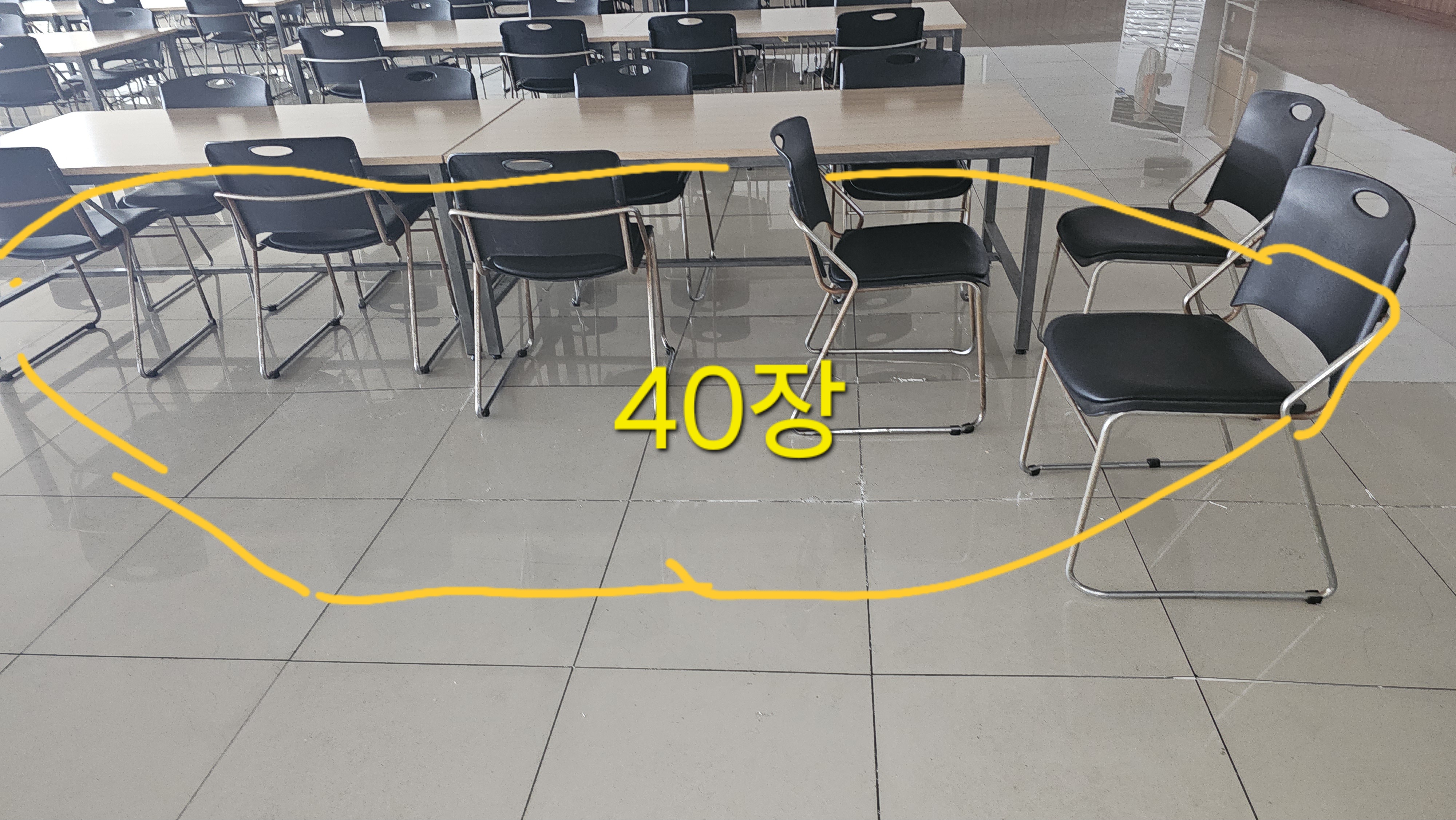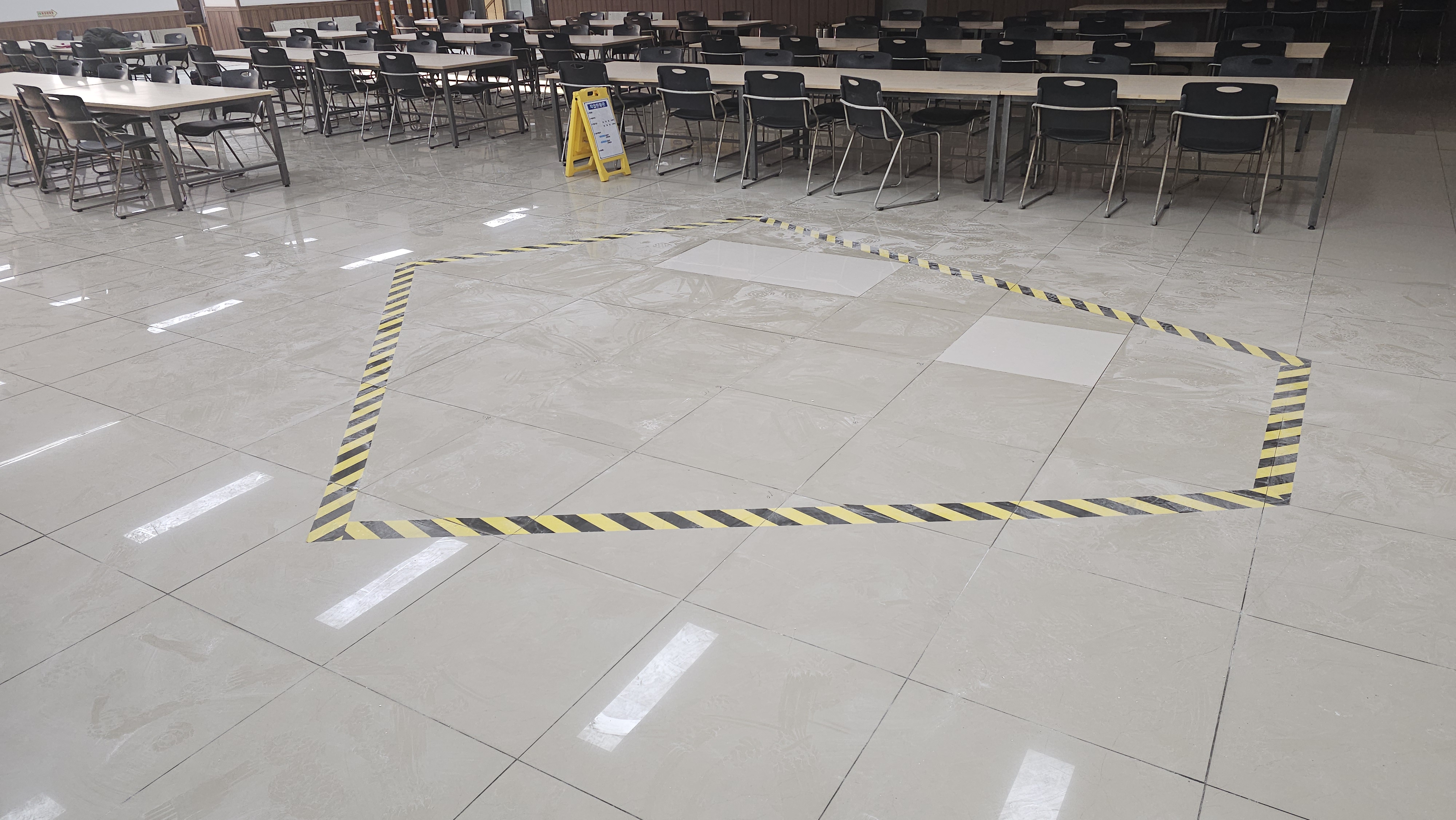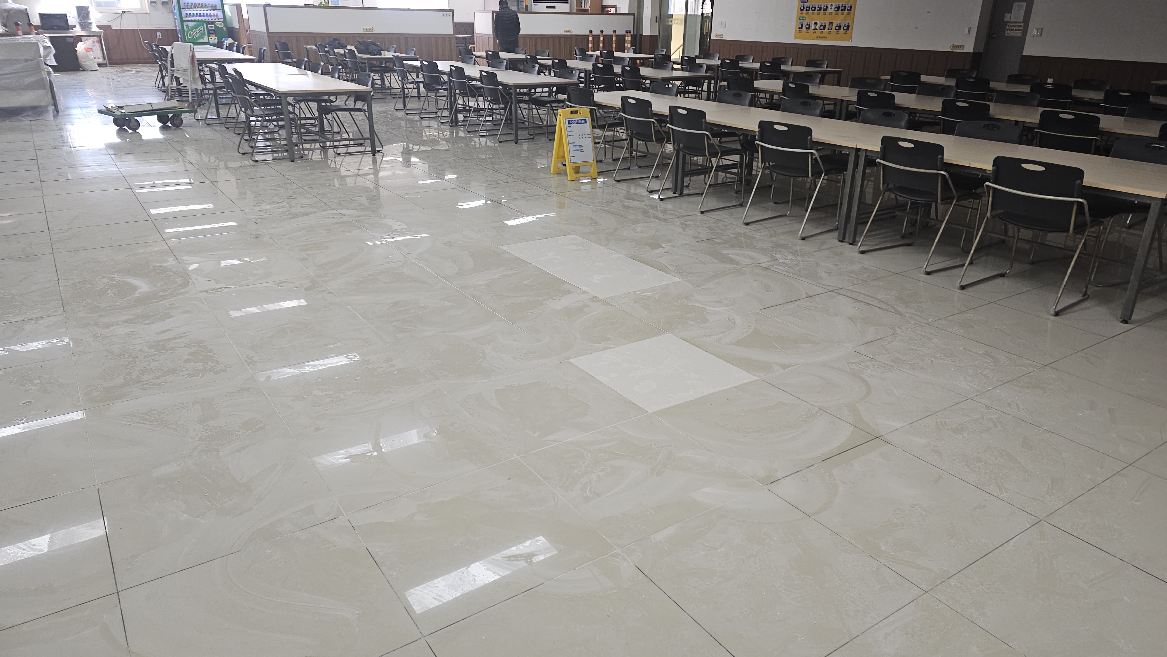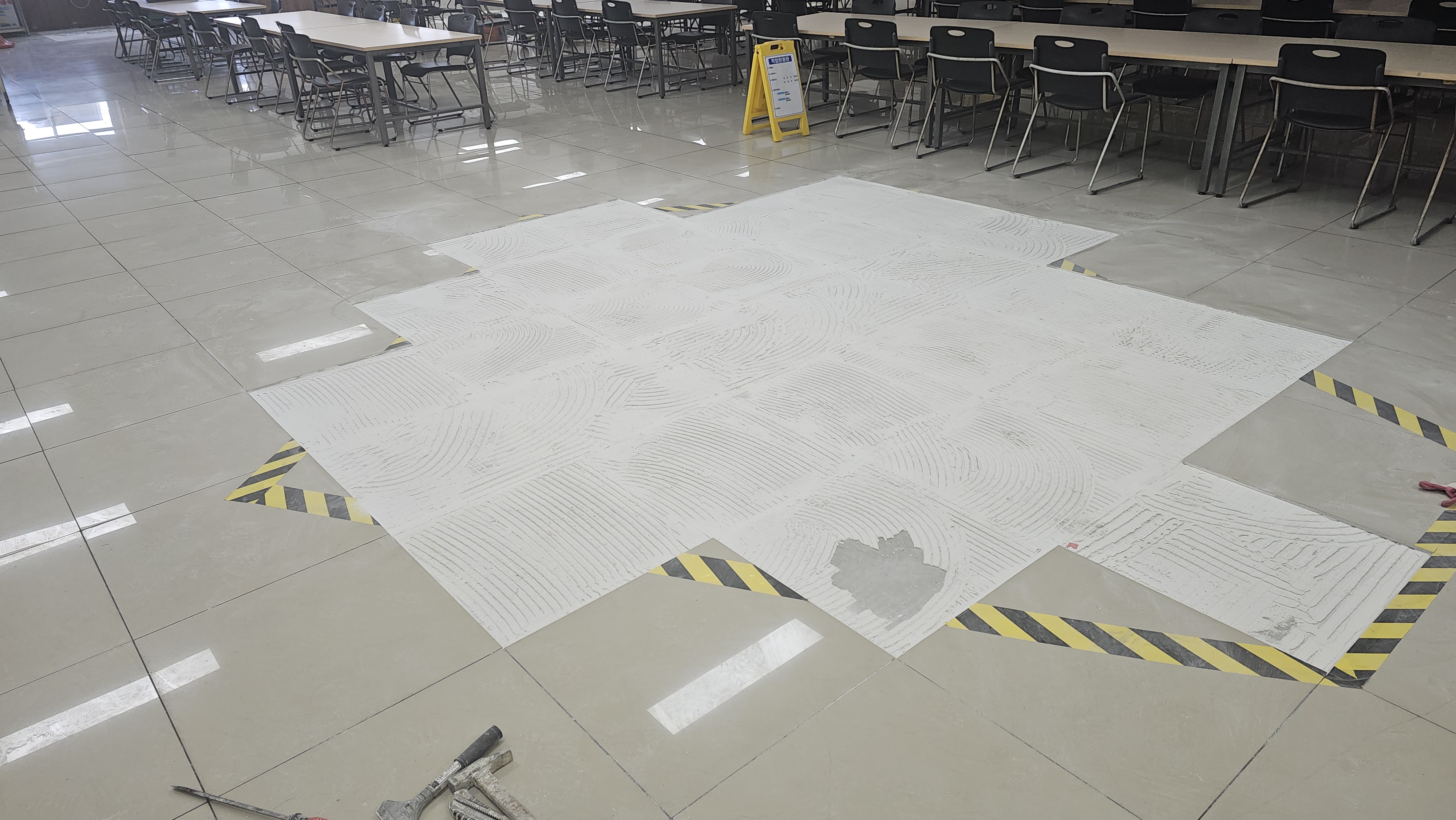 번쩍이는 폴리싱 타일 사이에 새겨진 줄눈은 이제 타일들이 다시는 솟구쳐 오를 꿈도 꾸지 못하게 만드는 강력한 봉인술이라오. 흥흥 줄눈이 들어가니 비로소 전장의 어수선함은 사라지고, 구내식당은 식사의 전당으로 거듭났소. 흥흥