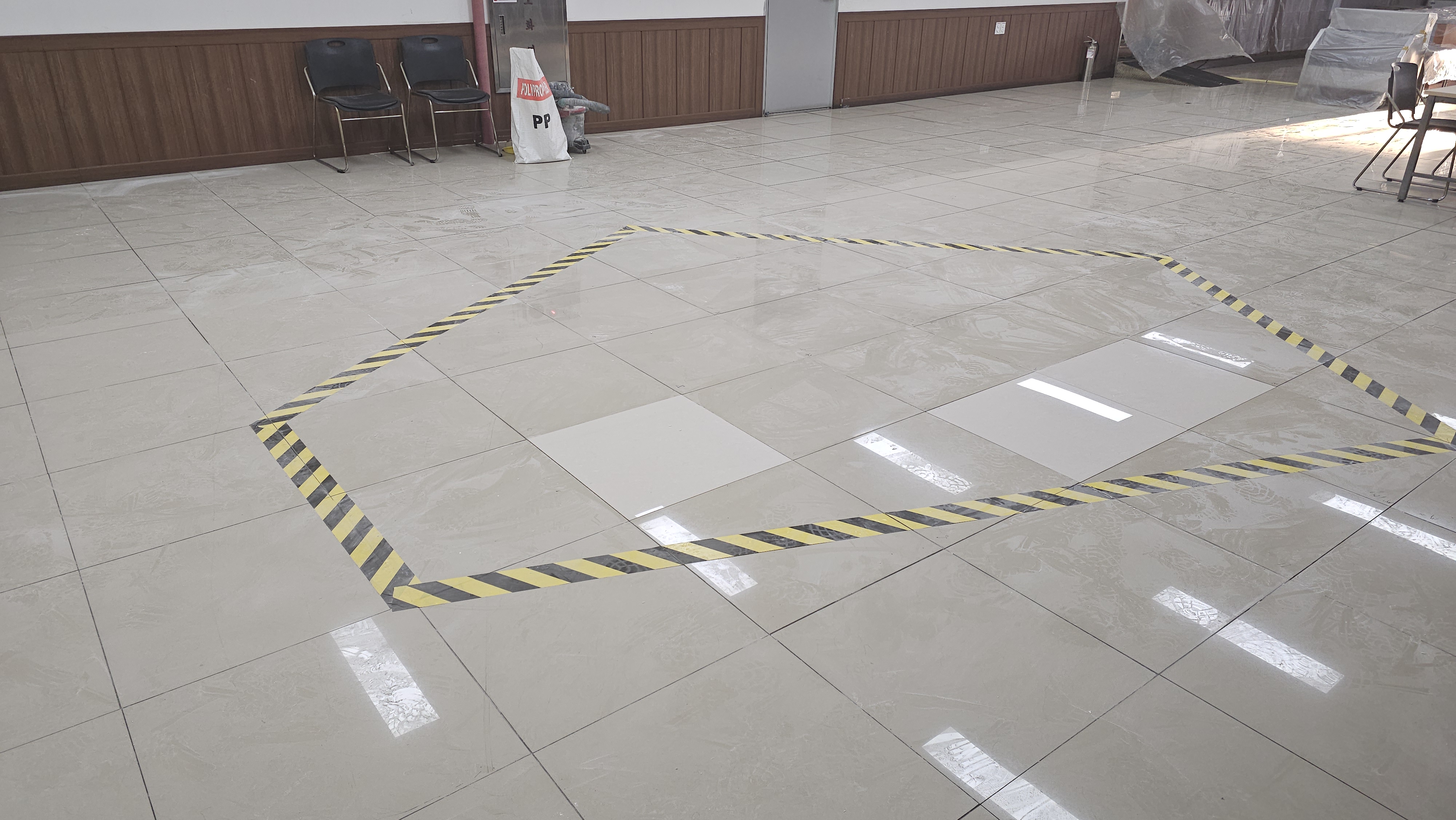모든 작업이 완료된 현장은 그야말로 장관이었소. 흥흥 노란색 테이프(성벽) 안에서 훈련받던 타일들이 이제는 완벽한 대지가 되어 전 군사(직원) 들을 맞이할 준비를 맞추었소. 흥흥 이제 이 바닥 은 수천 명이 밟고 지나가도, 무거운 식자재 수레가 굴러가도 끄떡없소! 아덱스의 강력한 결속력과 옥토바스 장군의 정석 시공이 만났으니 말이오. 흥흥
