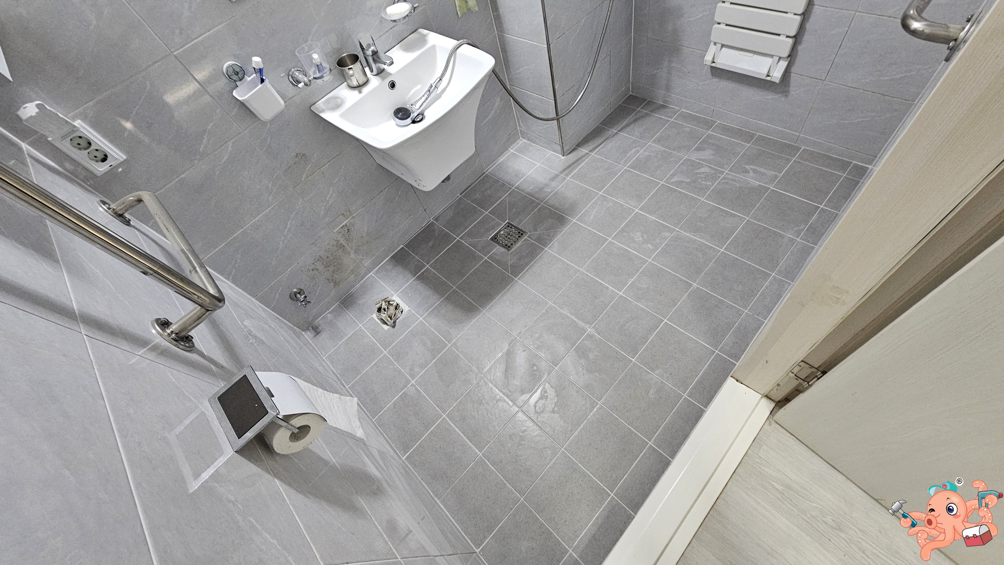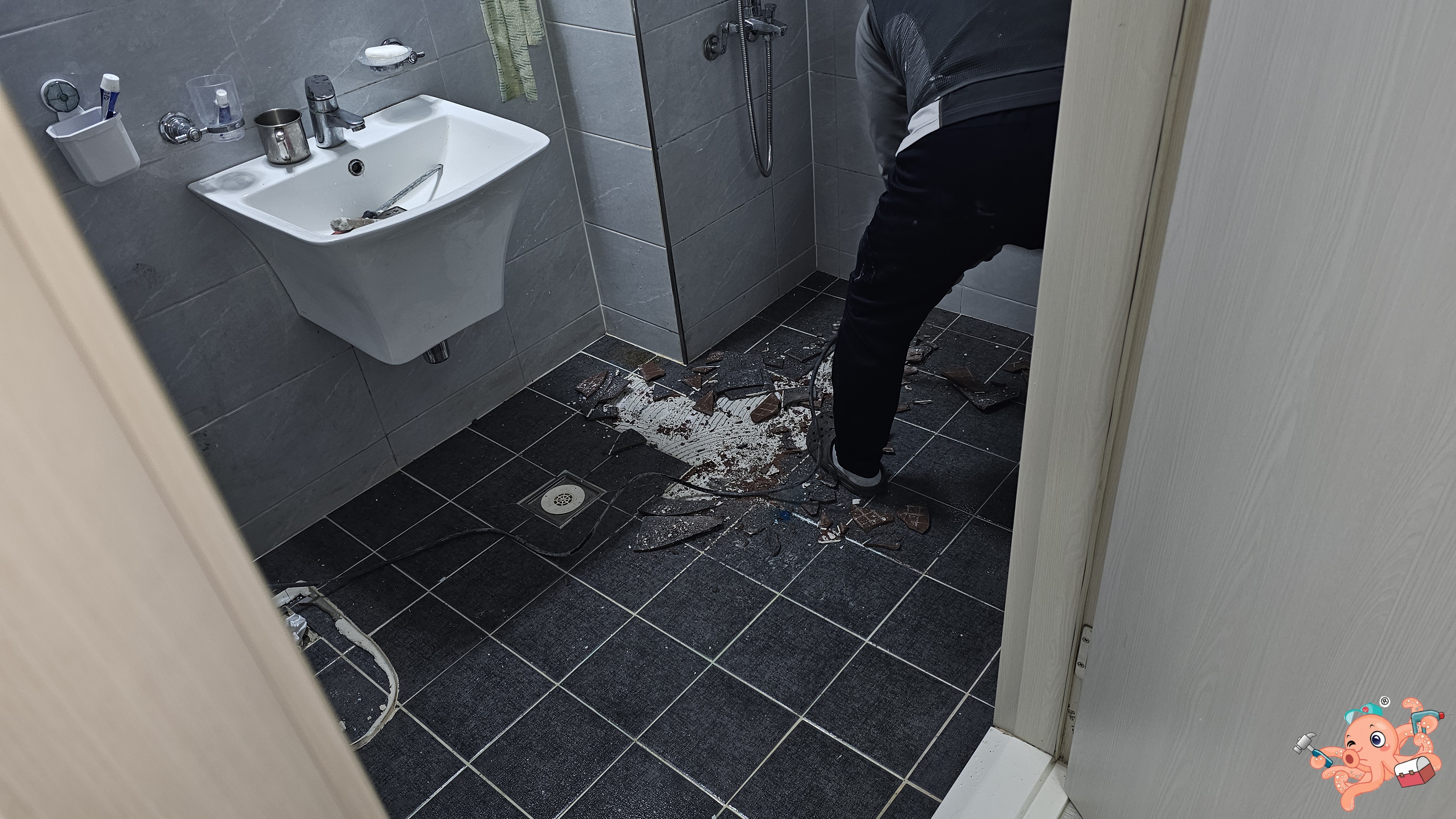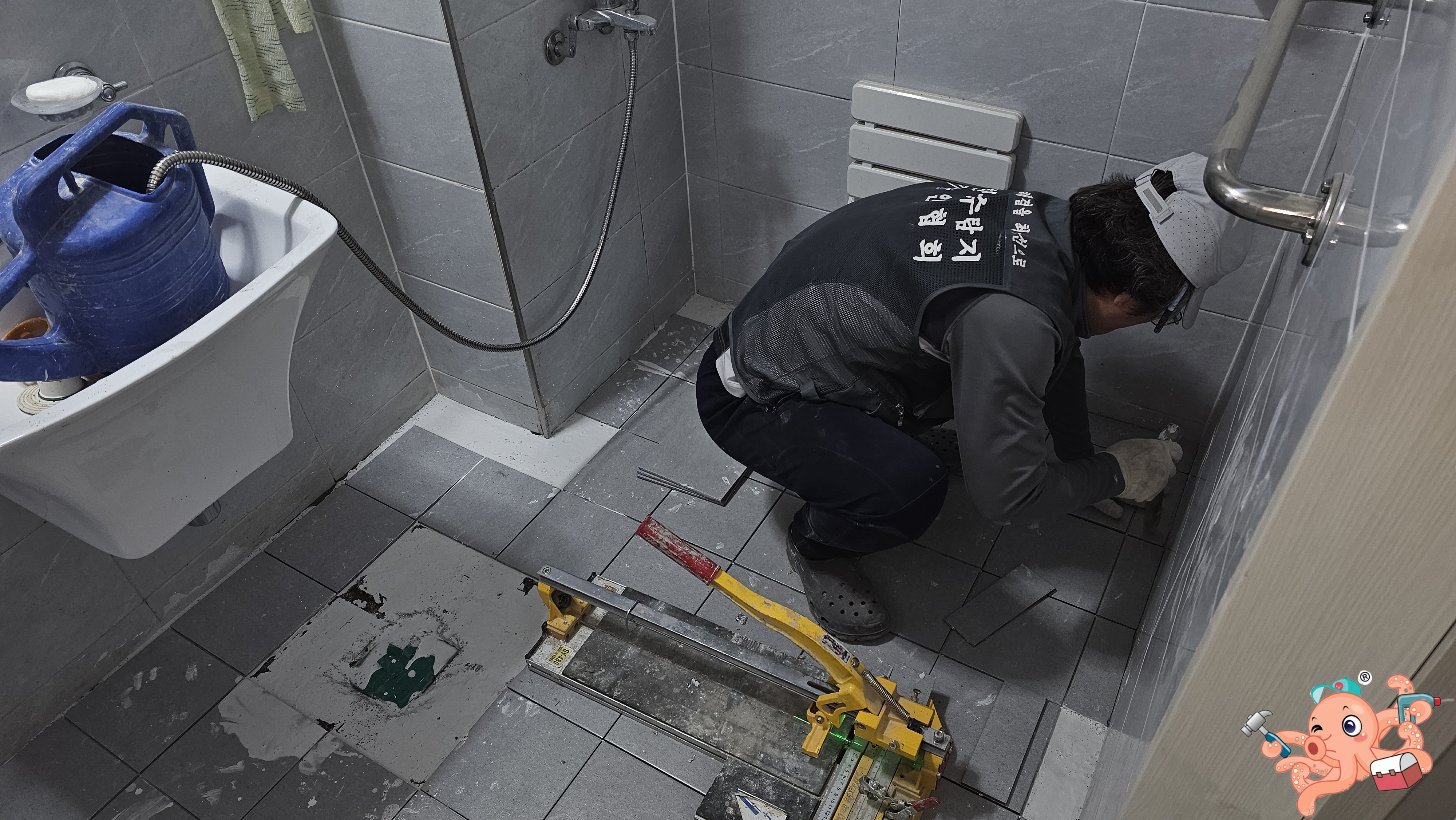장군이 전장에 임함에 있어 가장 먼저 살피는 것은 바로 무고한 백성의 안위라! 본격적인 파쇄공사에 들어가기 전, 장군은 거실 바닥에 **'철통 보양 결계'**를 쳤소.흥흥 청룡언월도와 같은 뿌레카의 비산먼지와 거친 파편들이 혹여나 주인장의 소중한 거실 바닥에 상처를 낼까 염려하여, 보양재(커버링)를 빈틈없이 깔아 방비했구려.흥흥 이것이 바로 기술보다 앞서는 옥토바스 장군의 자비로운 심법(心法)! 거실은 고요한 평화를 유지한 채, 욕실 안에서만 치열한 전투가 시작되었소.흥흥