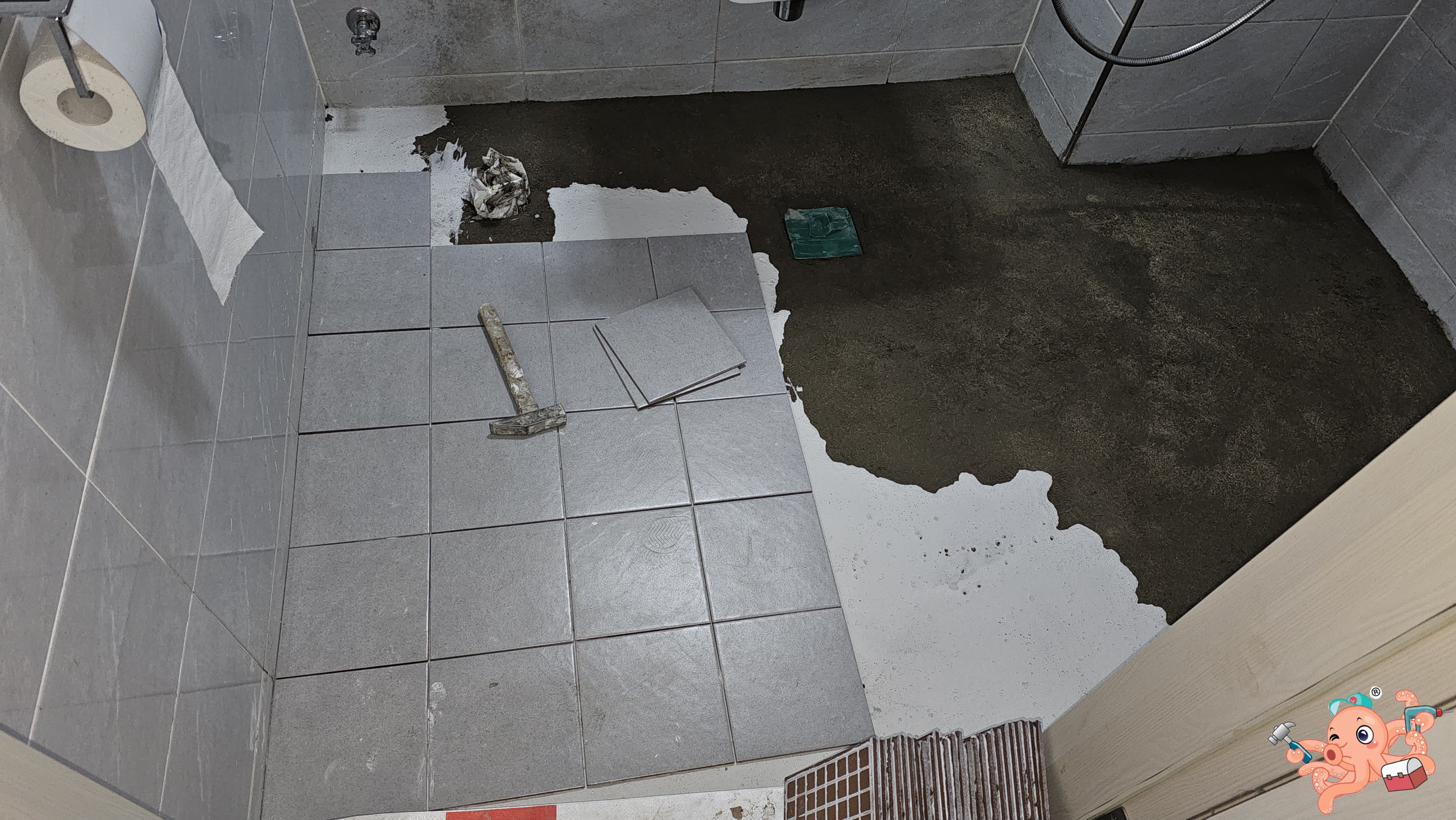 경쾌한 콧노래와 함께 냉가망치 자루가 타일 위를 톡톡! 건드리니, 신기하게도 단차가 마법처럼 사라지더이다.흥흥 이 망치 자루의 타격은 과하지도 부족하지도 않은 '중용(中庸)'의 도를 지키니, 타일들은 자석처럼 바닥에 밀착되어 완벽한 경계를 형성했소.흥흥 옥토바스 타일힐러의 30여 년 내공이 담긴 망치질 한 번에 수마는 도망갈 길을 잃고 굴복하였구려!흥흥
