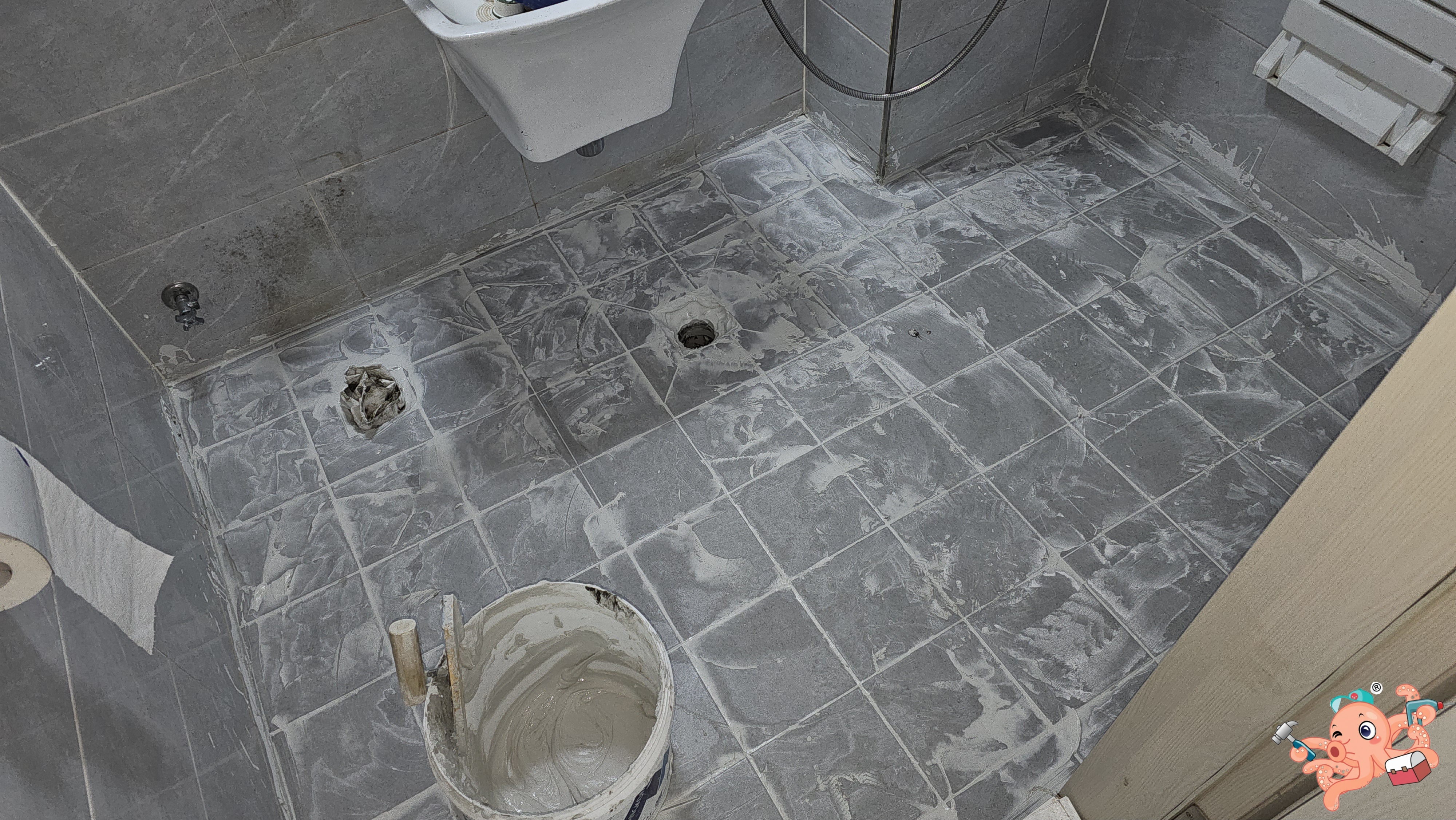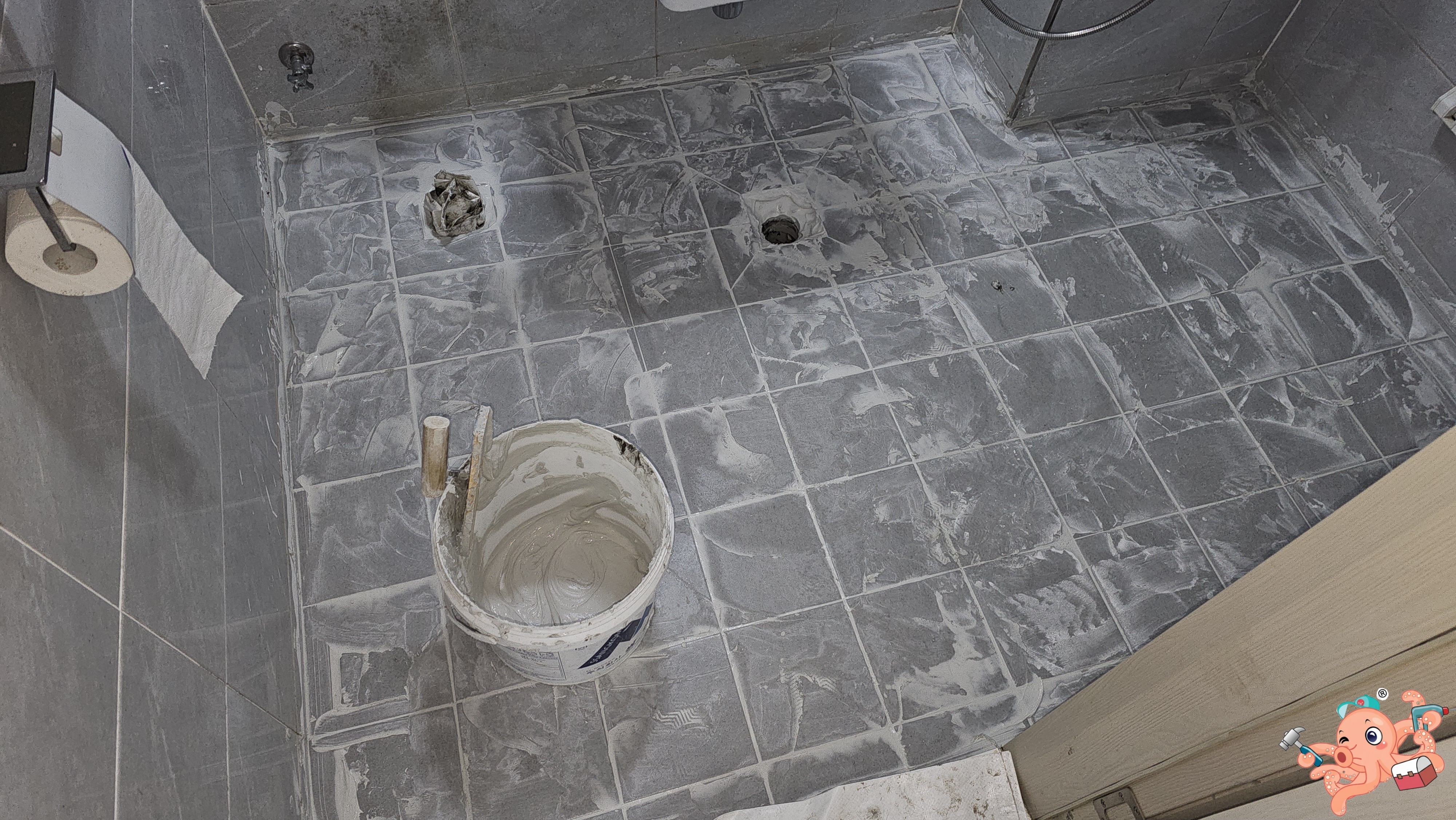 방수액이 마른 뒤에는 대지의 기운을 상징하는 사모래를 산처럼 쌓아 올렸소.흥흥 그리고는 물길이 배수구로 일사천리(一瀉天里) 흐를 수 있도록 **물메(주꾸미)**를 잡기 시작했소.흥흥 자나무를 올리고 장군의 예리한 육감으로 바닥을 나라시 하니, 그 평평함이 마치 명검의 날처럼 곧고 거울처럼 매끄러웠소.흥흥 이 기초가 튼튼해야만 이후의 타일 공사가 불후의 명작이 되는법!흥흥