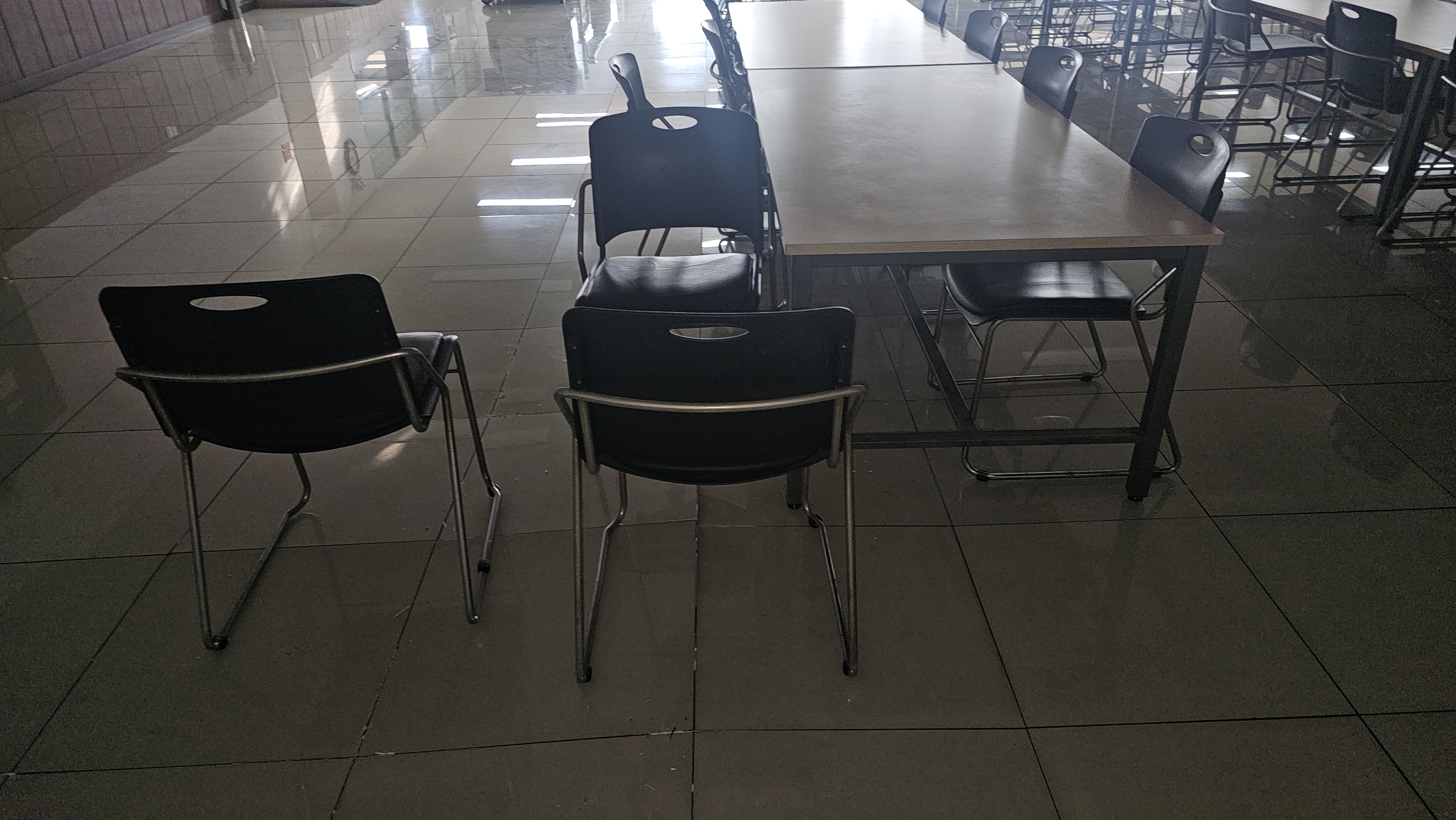 번쩍이는 폴리싱 타일 사이에 새겨진 줄눈은 이제 타일들이 다시는 솟구쳐 오를 꿈도 꾸지 못하게 만드는 강력한 봉인술이라오. 흥흥 줄눈이 들어가니 비로소 전장의 어수선함은 사라지고, 구내식당은 식사의 전당으로 거듭났소. 흥흥